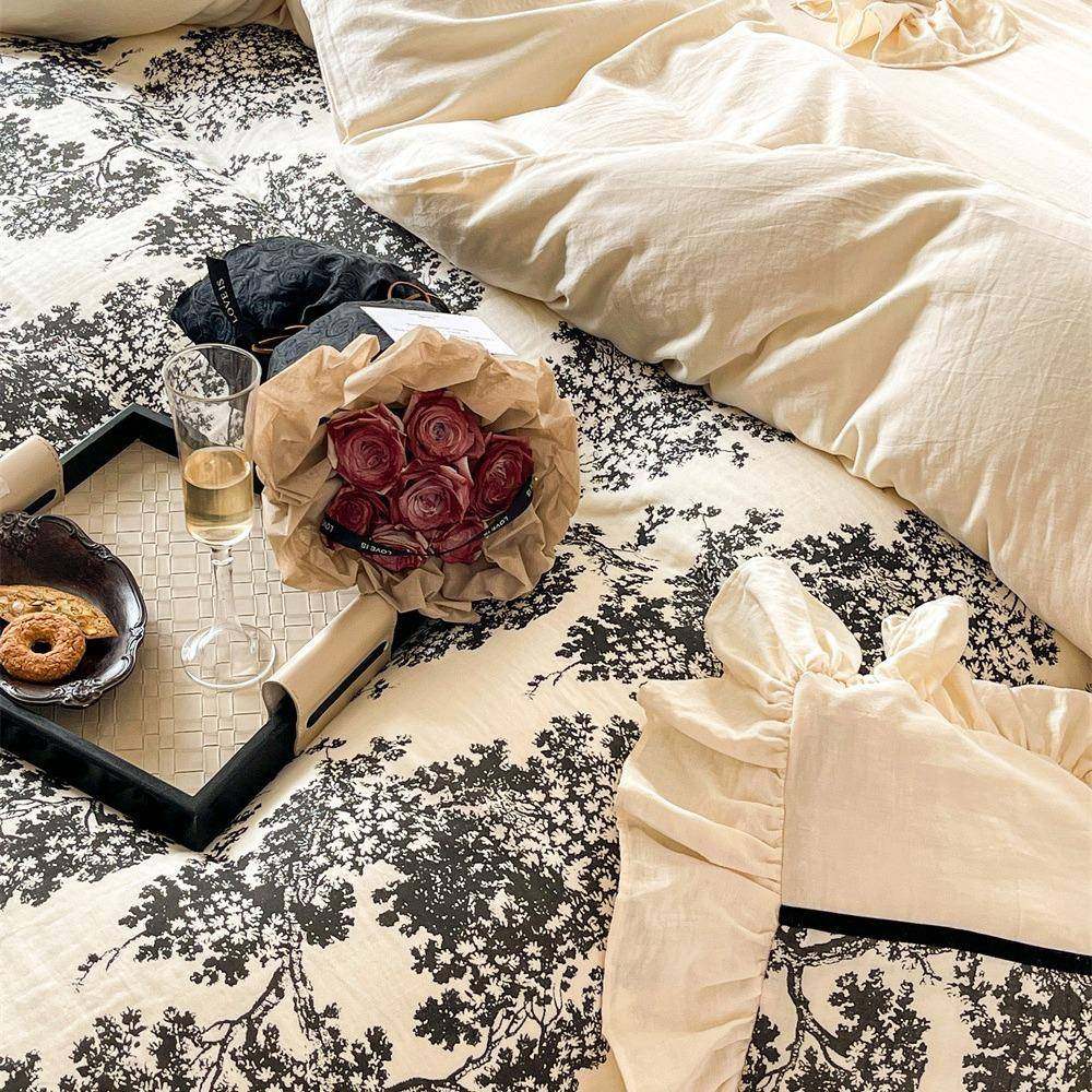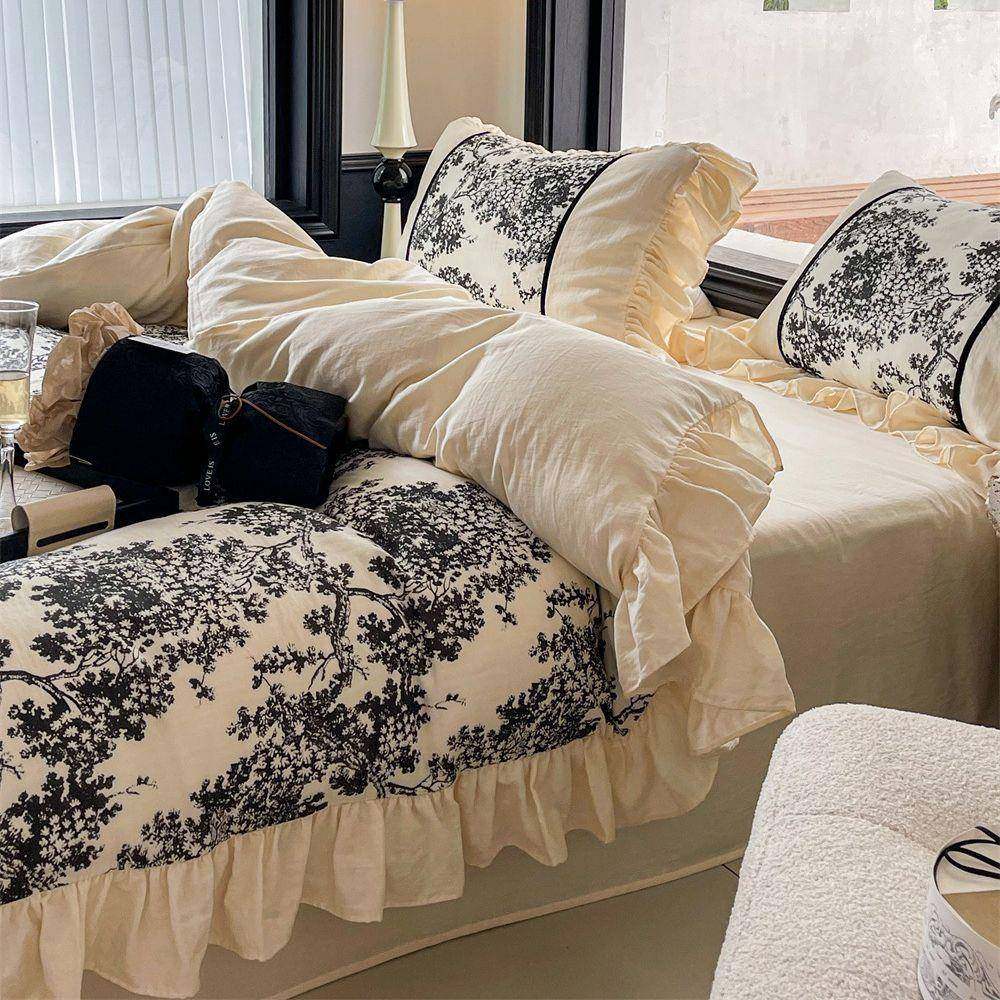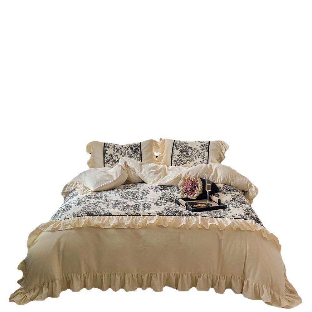 复古宫廷风荷叶花边双层纱别墅款亲肤双人透气卧室床笠四件套