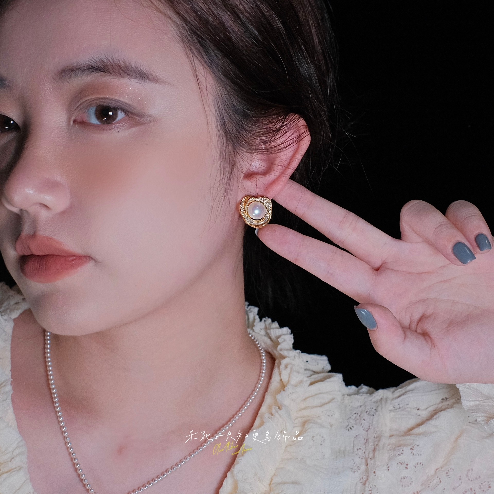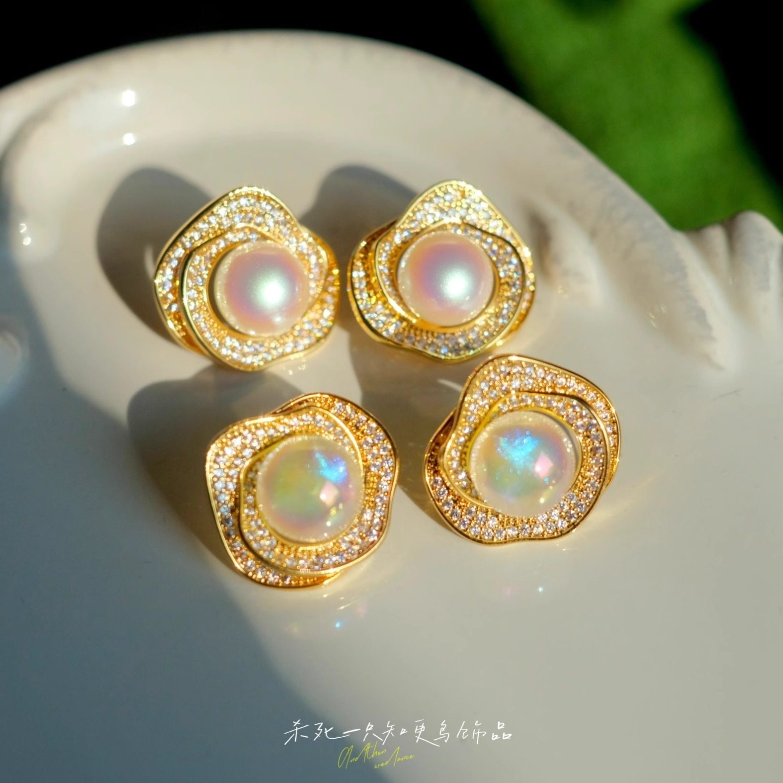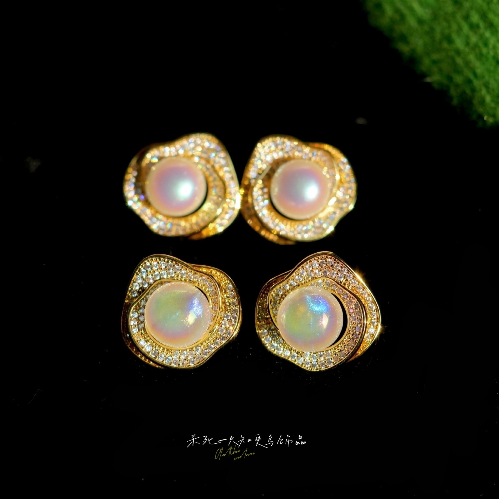 《玻利维亚》复古优雅宫廷风人鱼姬粉光马贝珍珠锆石花朵耳环耳饰