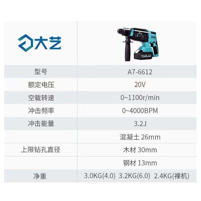 大艺新款A7-6612锂电冲击钻无刷电锤大功率混凝土电镐家用工业级