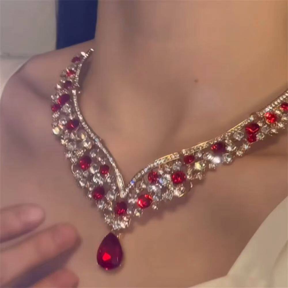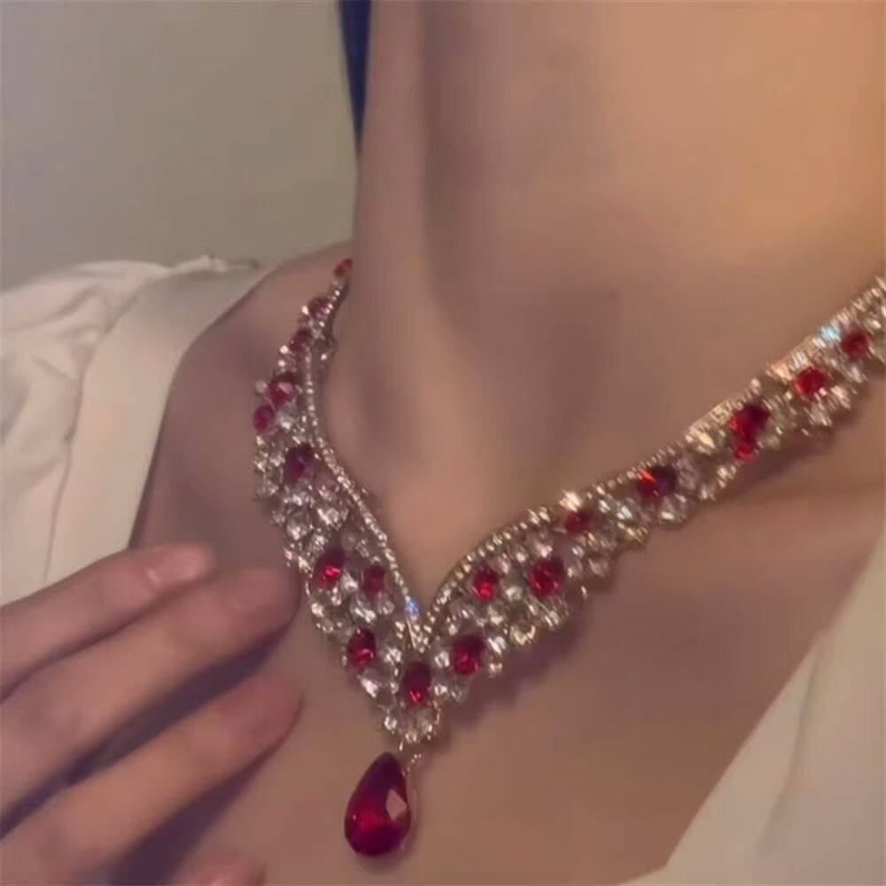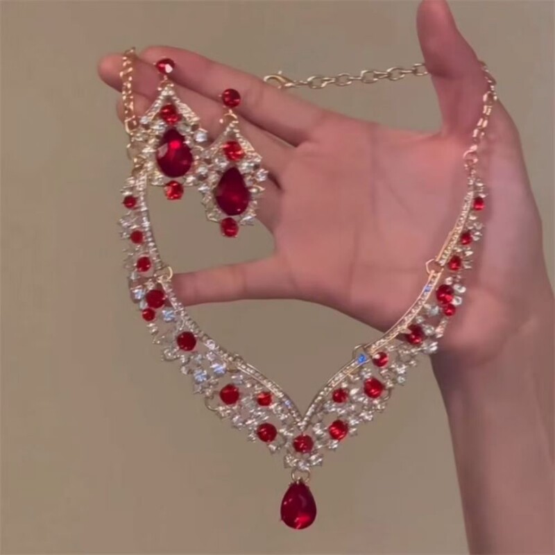 zoozmomo红色满钻锆石水滴项链耳环套装女新娘礼服宴会锁骨链配饰