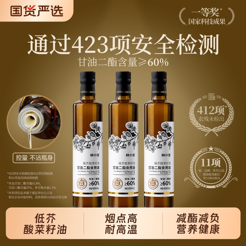 林小生甘油二酯食用油60%非转基因低芥酸菜籽油500ml健康玻璃瓶装