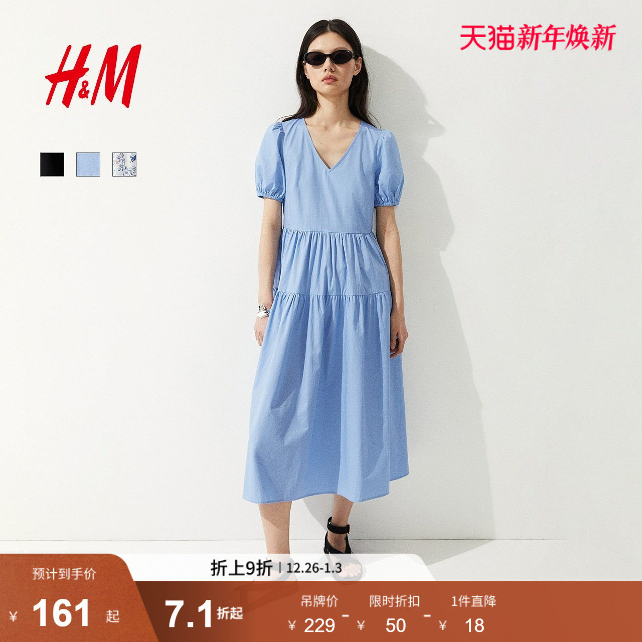 HM女装连衣裙2025冬季新款泡泡袖度假风V领植物印花长裙1287800