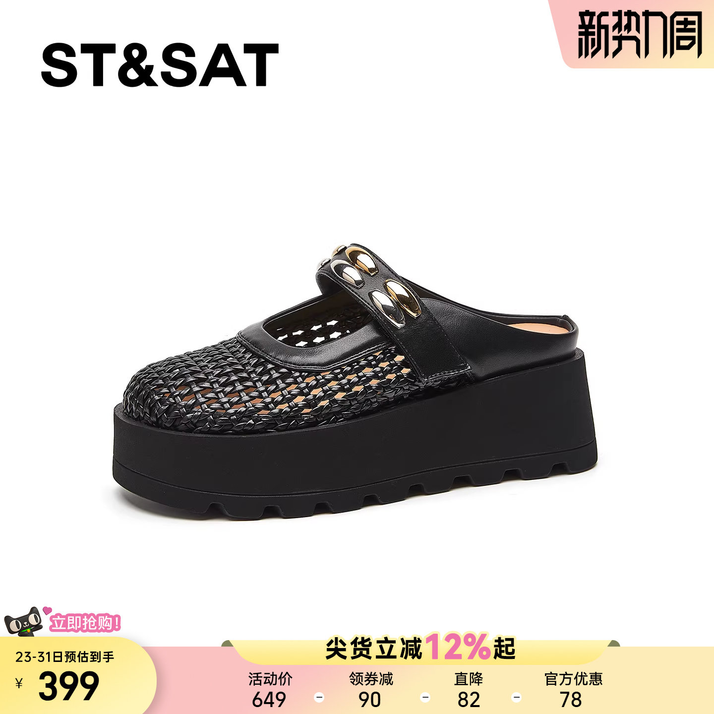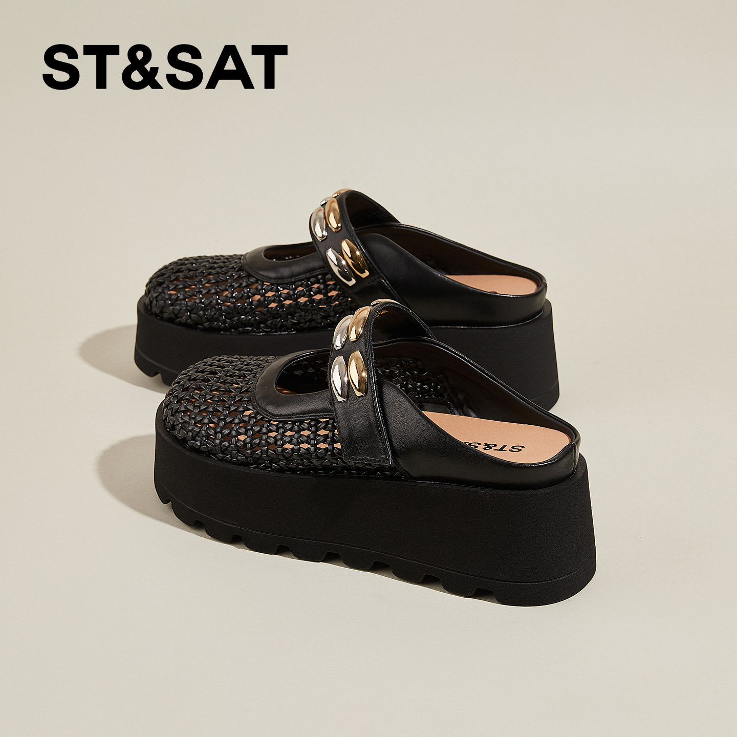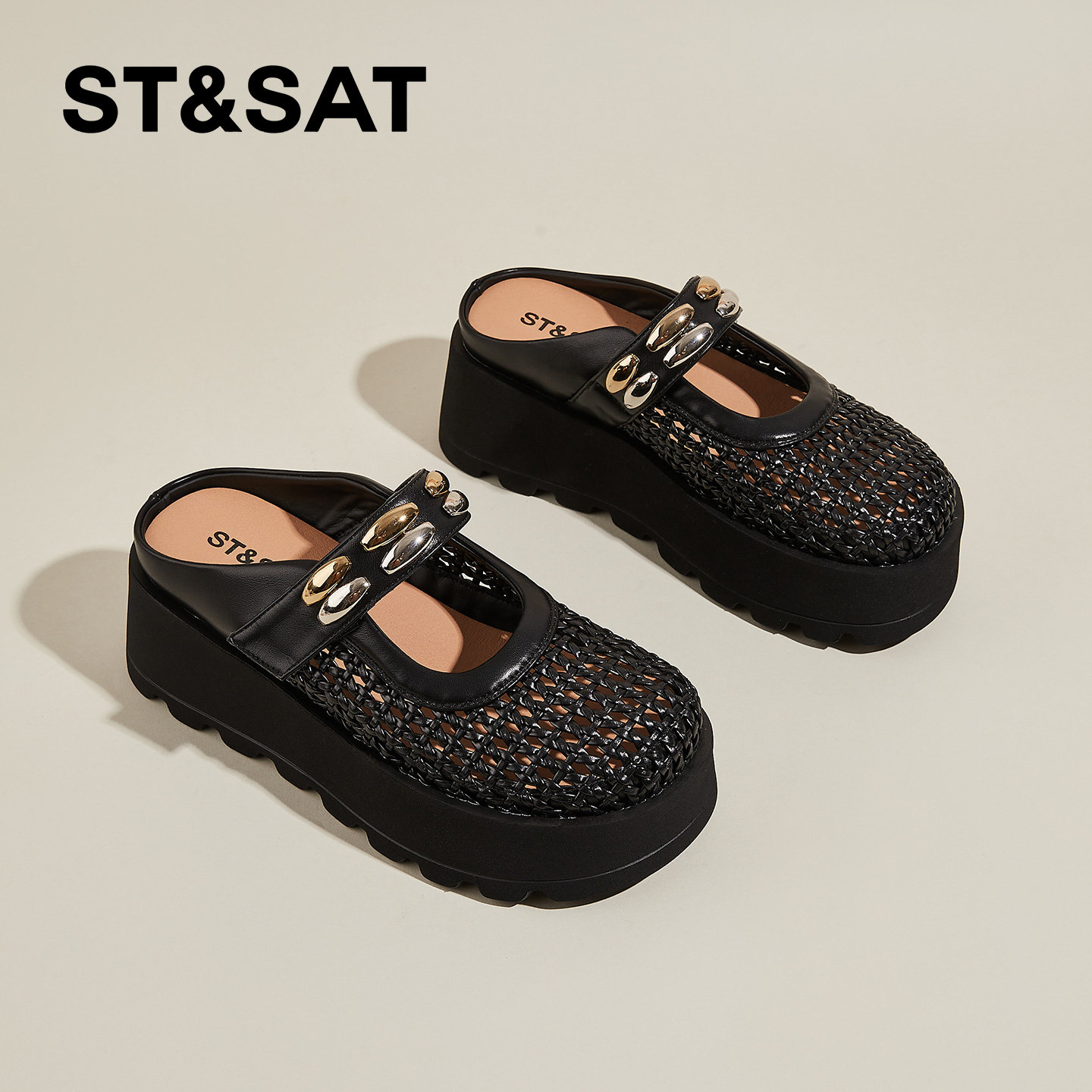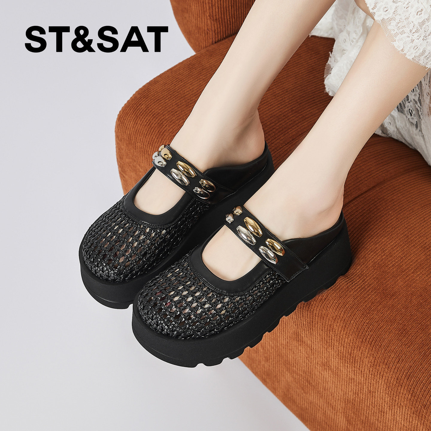 星期六镂空增高包头拖鞋女夏季新款编织透气一脚蹬懒人半拖鞋