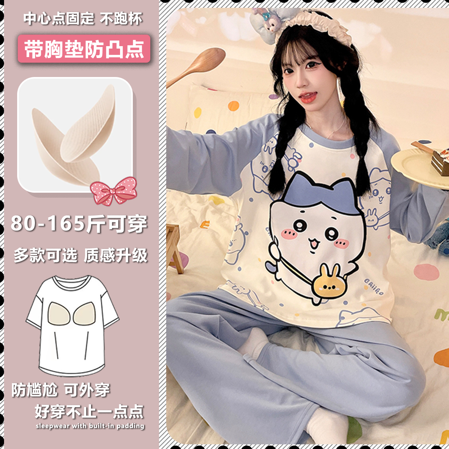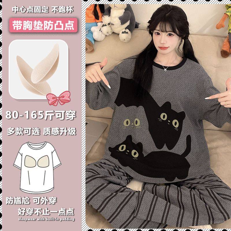 女款带胸垫春秋季睡衣胖mm可爱甜美高级感网红简约拼色长袖家居服