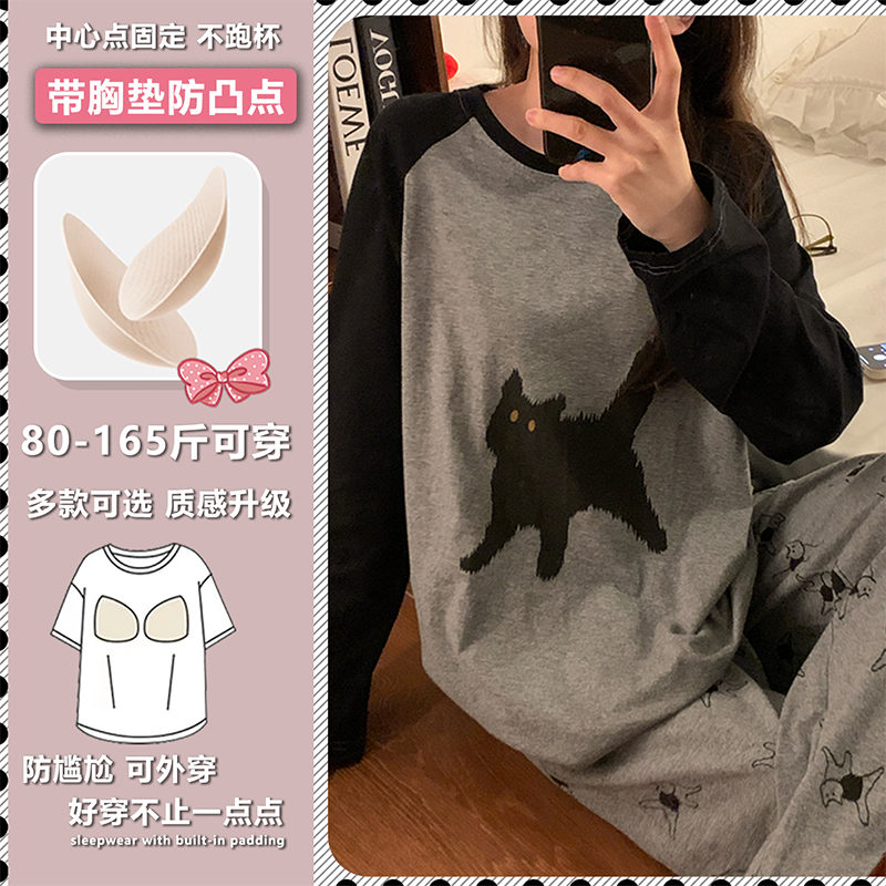 纯棉带胸垫睡衣女2025新款春秋季长袖套装可爱卡通韩版家居服秋冬