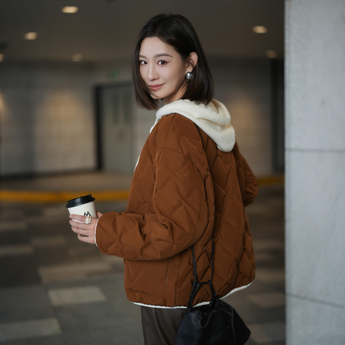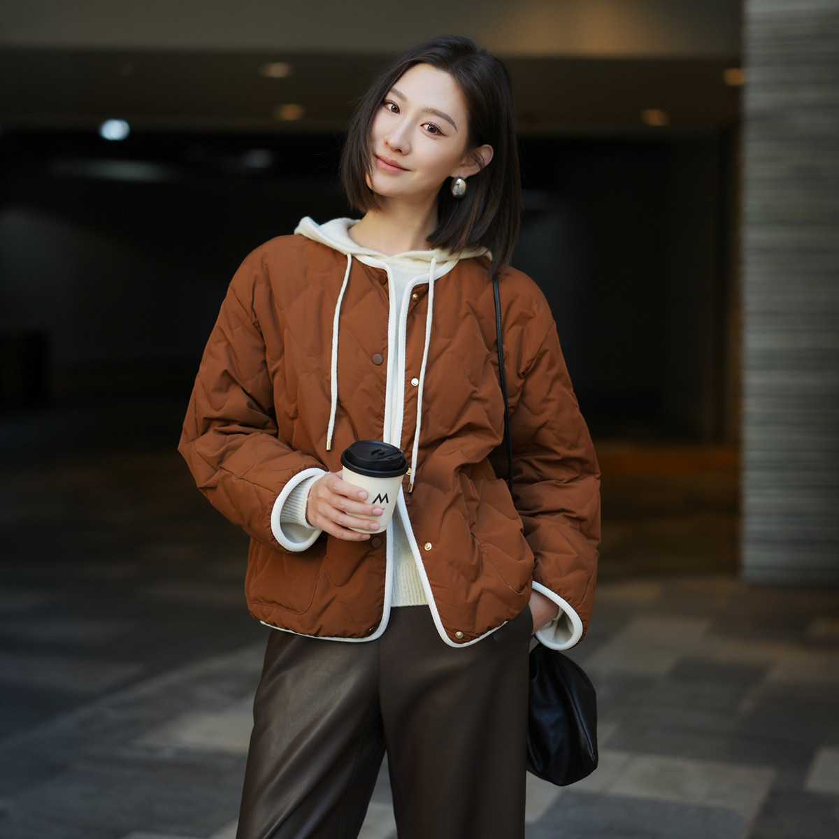 naivee纳薇25冬新款焦糖栗子圆领撞色绗缝羽绒服