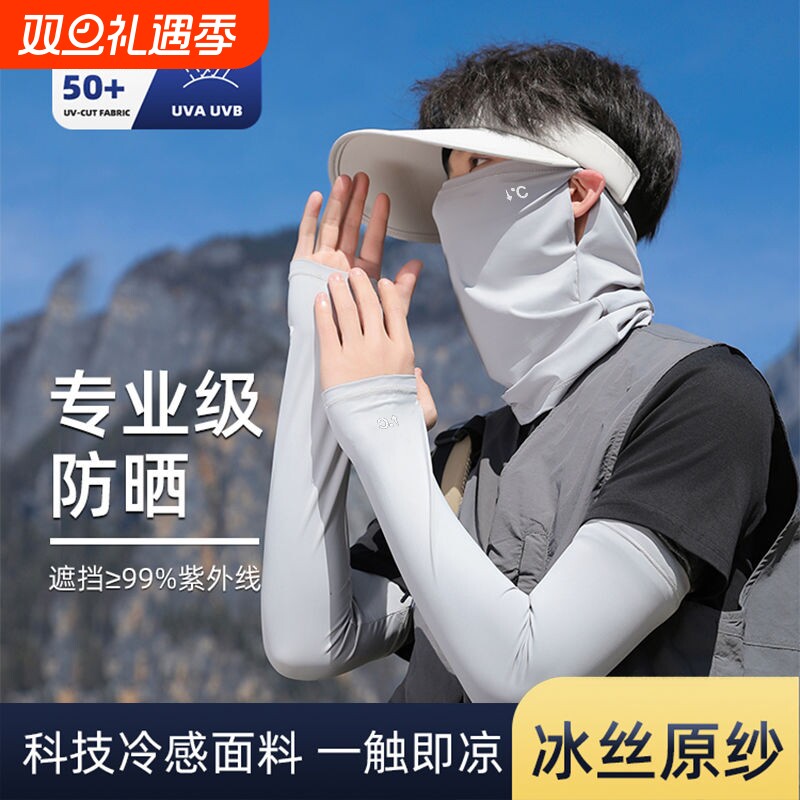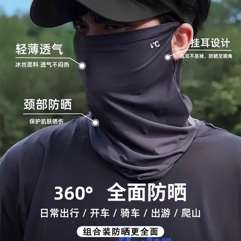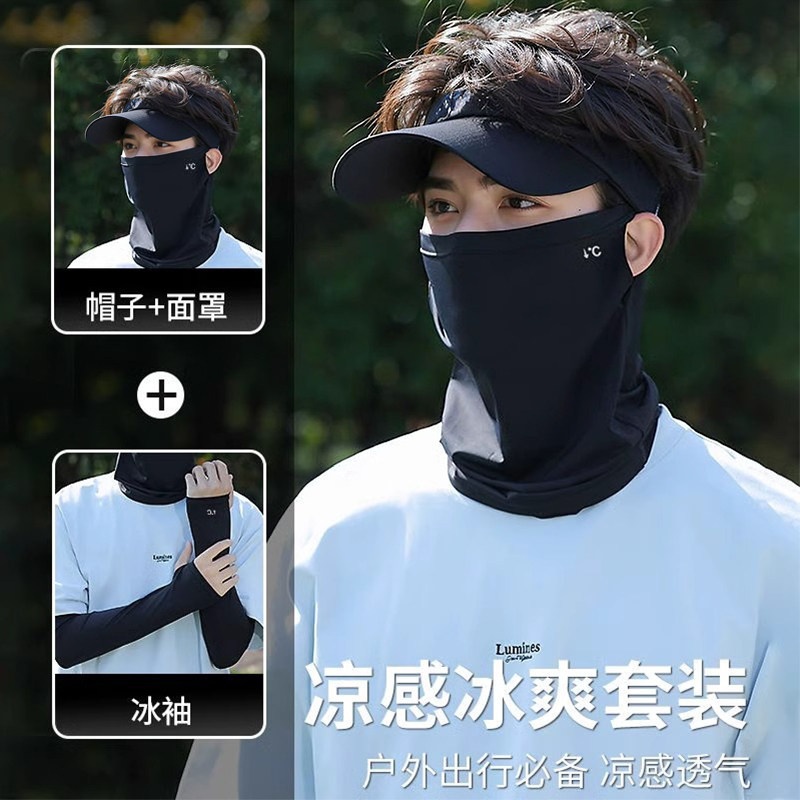 冰丝骑行防晒面罩男士防紫外线登山遮全脸面纱男款冰袖防晒帽套装