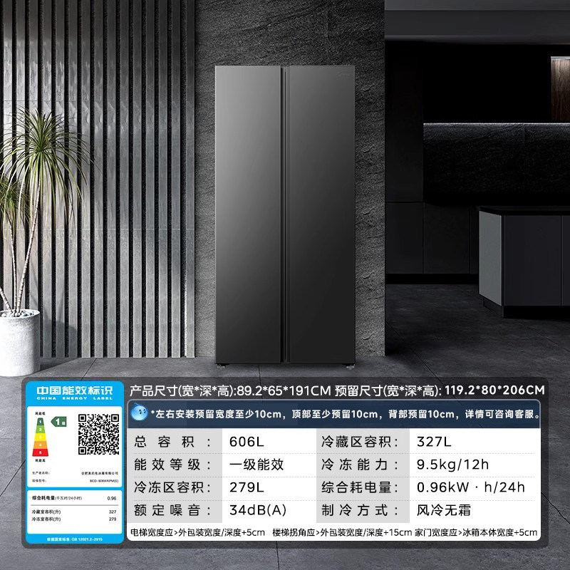 美的606对开双开门大容量超薄风冷无霜一级能效节能家用冰箱
