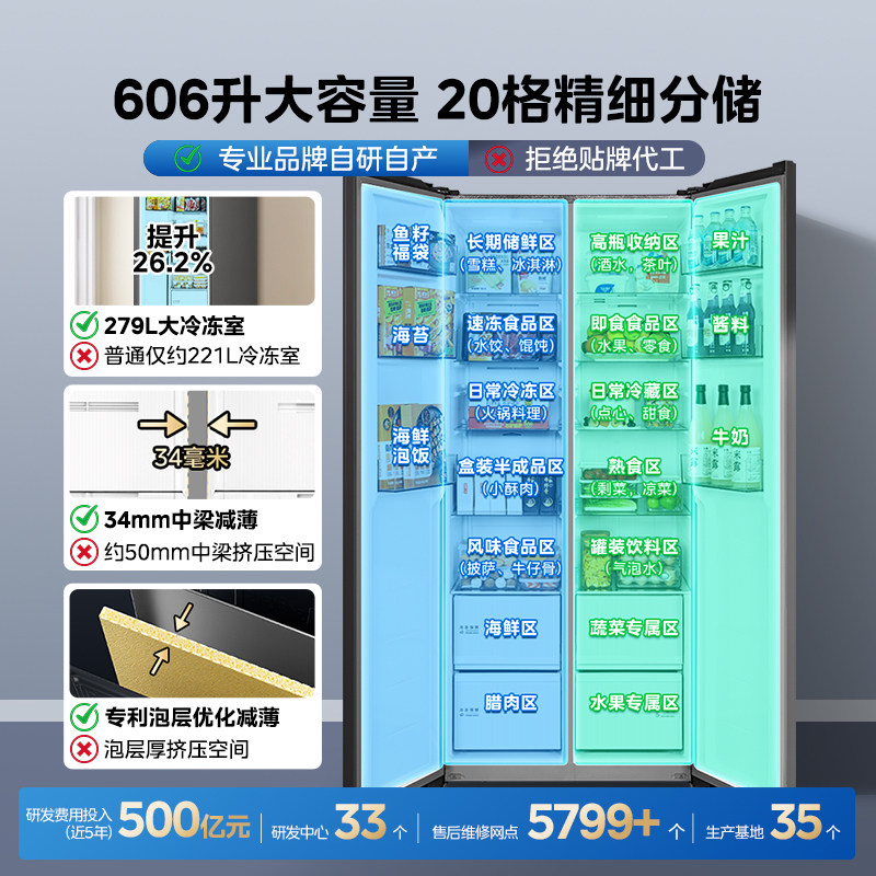 美的570+/606对开双开门两门大容量家用冰箱一级节能风冷无霜超薄