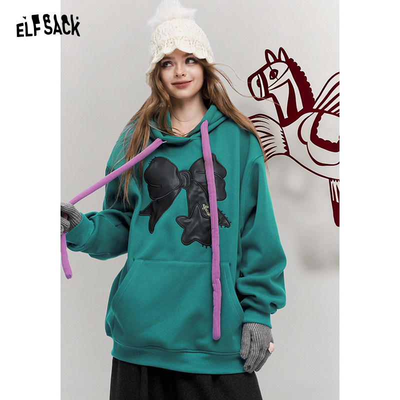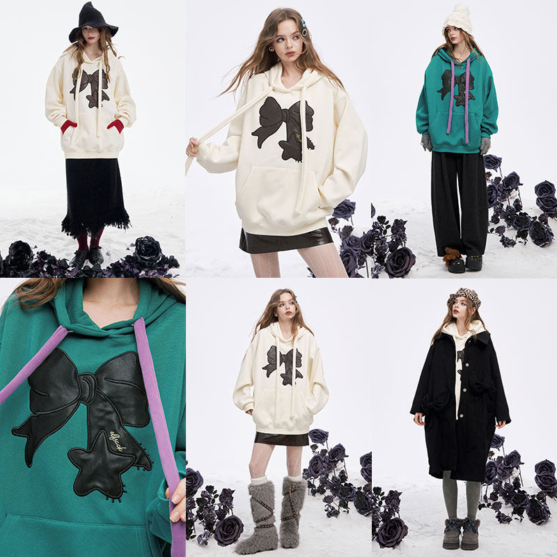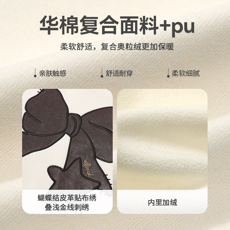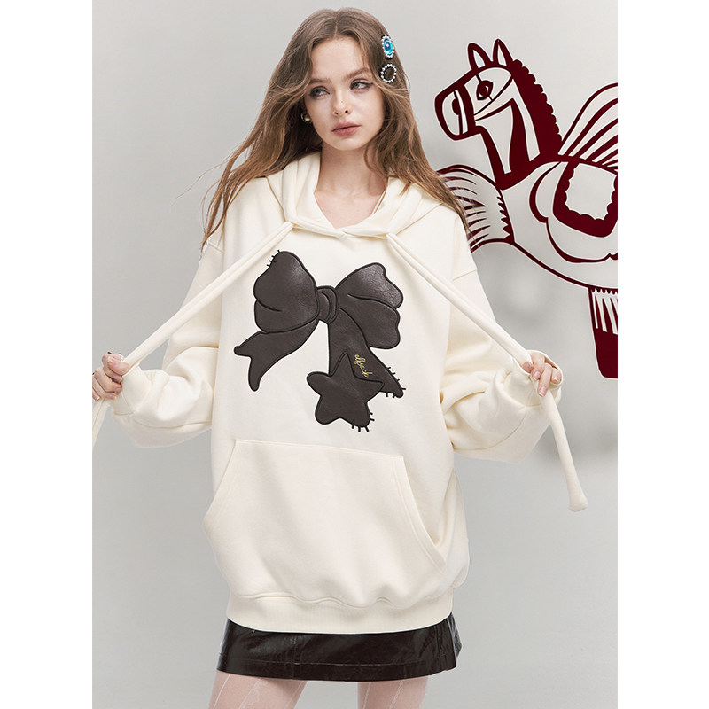 妖精的口袋白色蝴蝶结连帽加绒卫衣女2025冬新款小个子慵懒风上衣