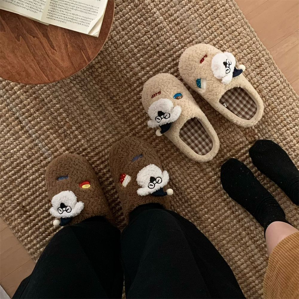 细细条男女士保暖新款趣味狗狗情侣月子棉拖鞋居家卧室舒适毛毛鞋
