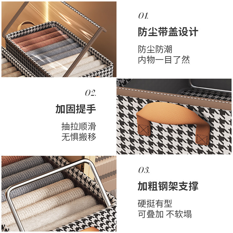 衣服收纳盒带盖千鸟格秋冬放衣柜收纳箱钢架家用折叠整理盒收纳筐