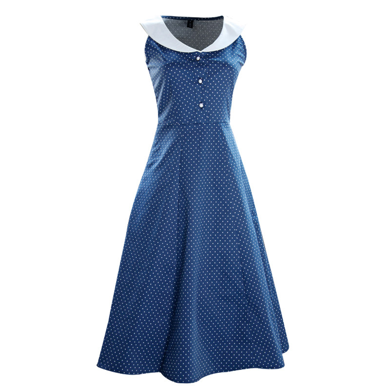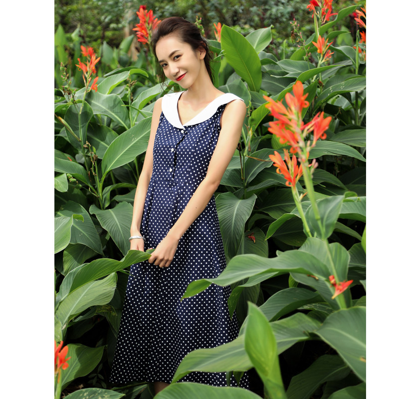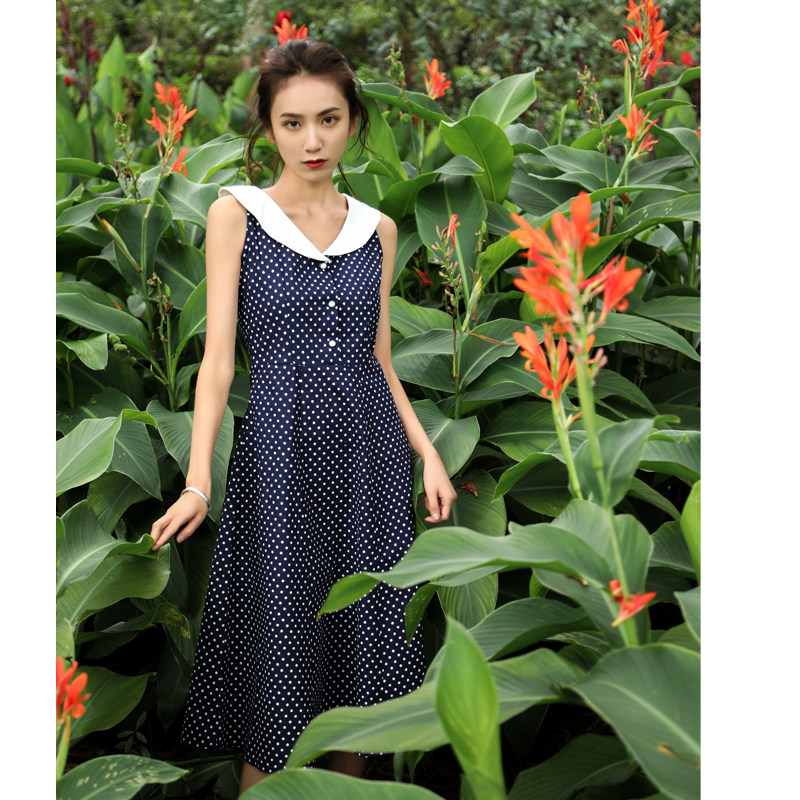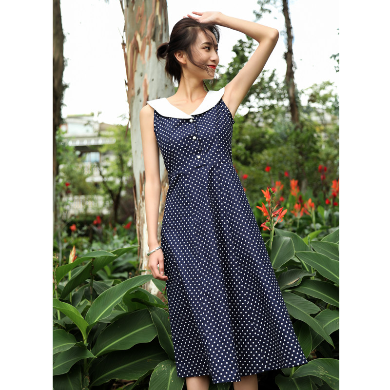 度假风复古奶油领波点珍珠扣修身大摆A字裙高腰无袖连衣裙chic女