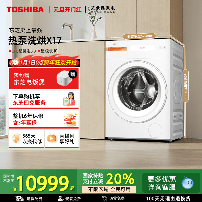 [政府补贴不限区域]东芝X17热泵洗烘一体机12KG全自动滚筒洗衣机