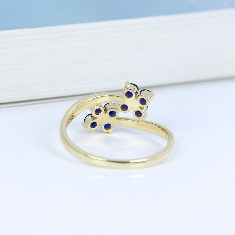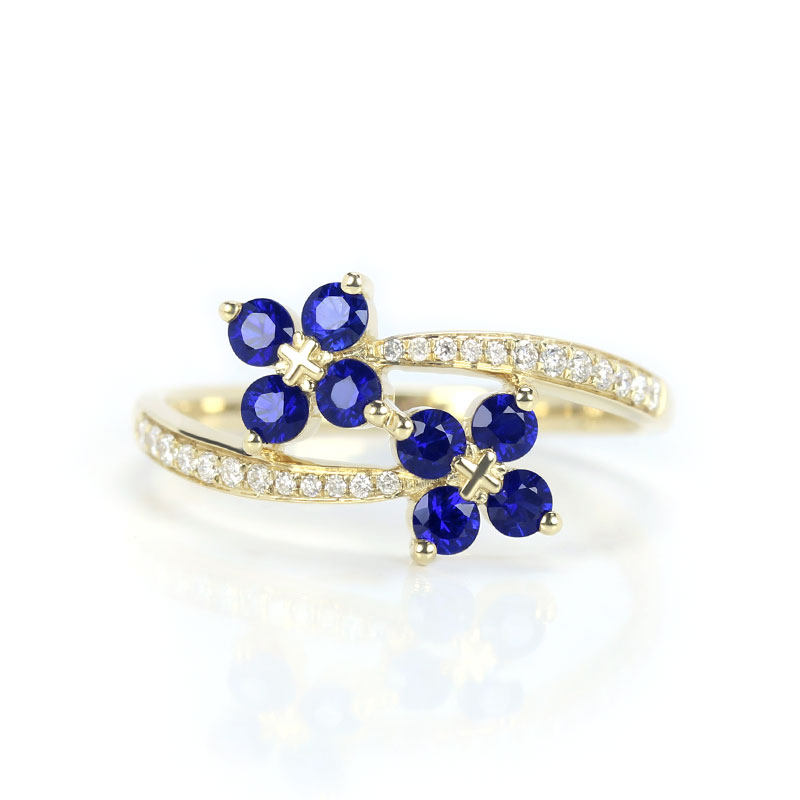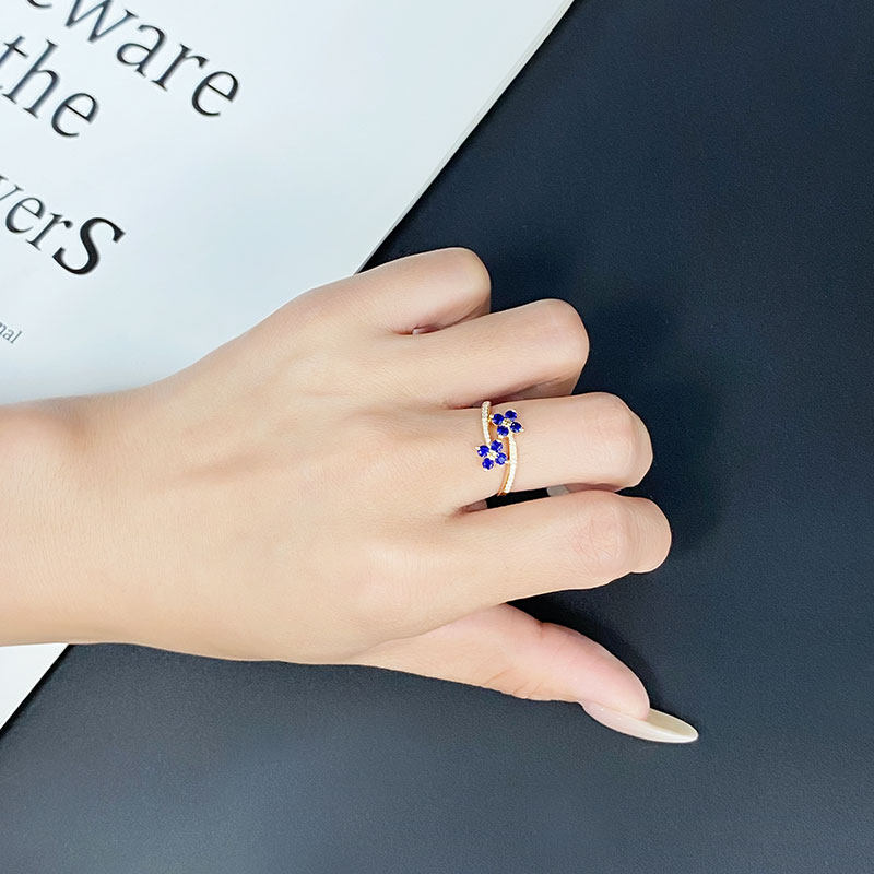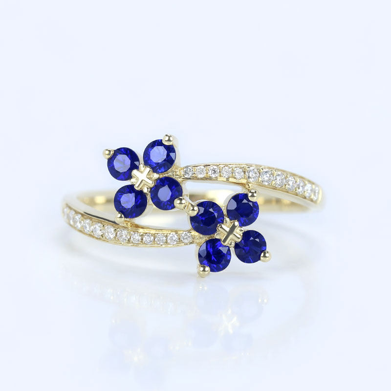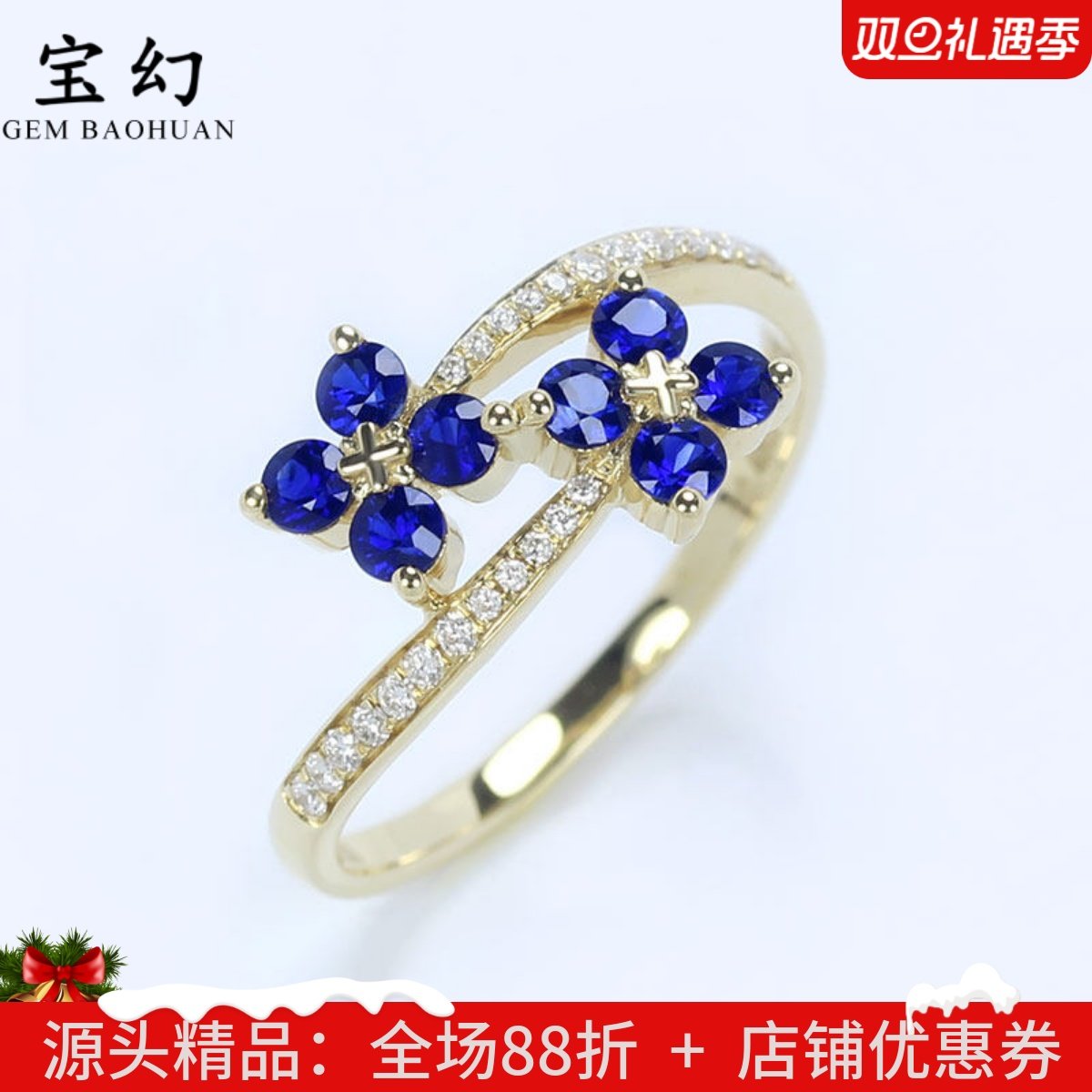 G18K黄金天然皇家蓝宝石双生花四叶草戒指 镶钻石正蓝色女款正品