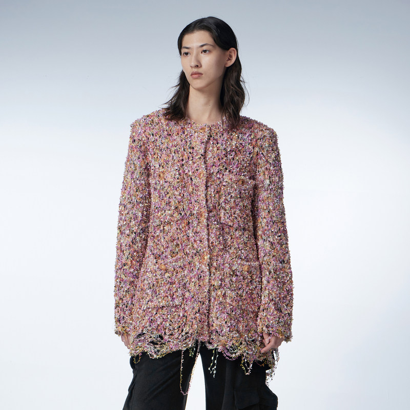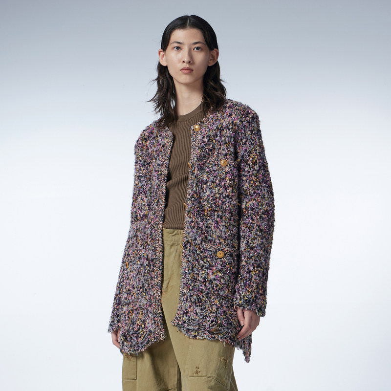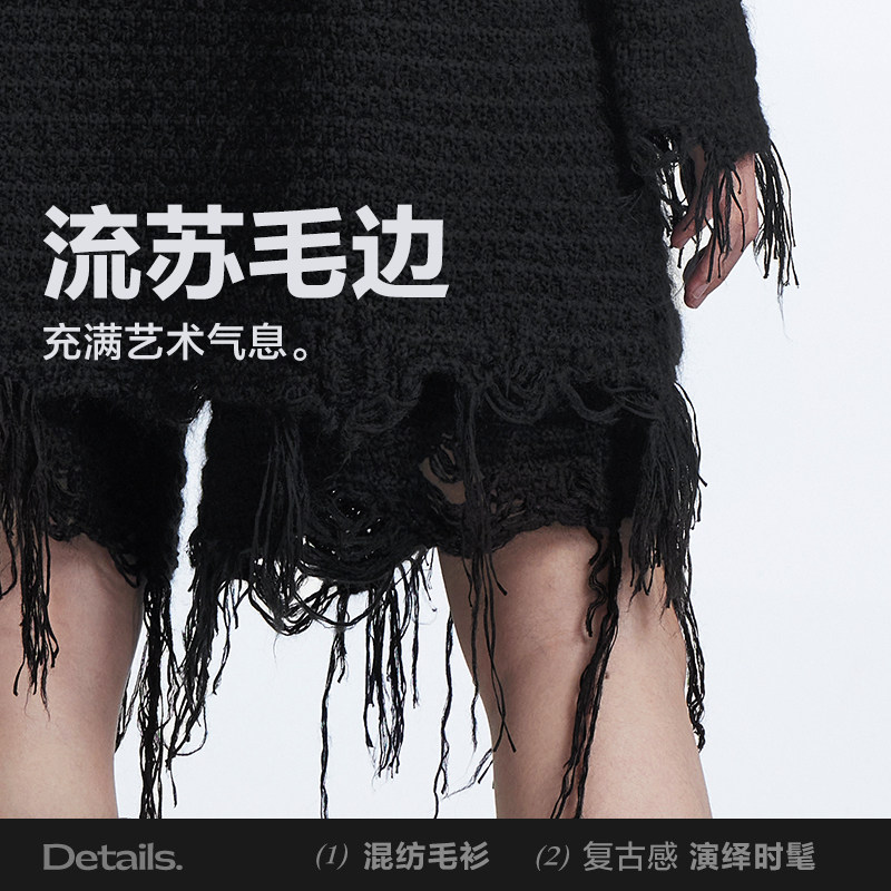 JNBY/江南布衣秋季小香风针织外套下摆毛边编织单排扣开襟毛衫女