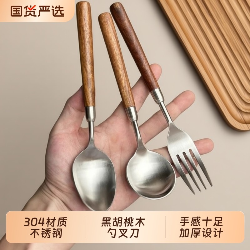 日式复古实木胡桃木柄304不锈钢餐具套装哑光西餐刀勺叉家用汤勺