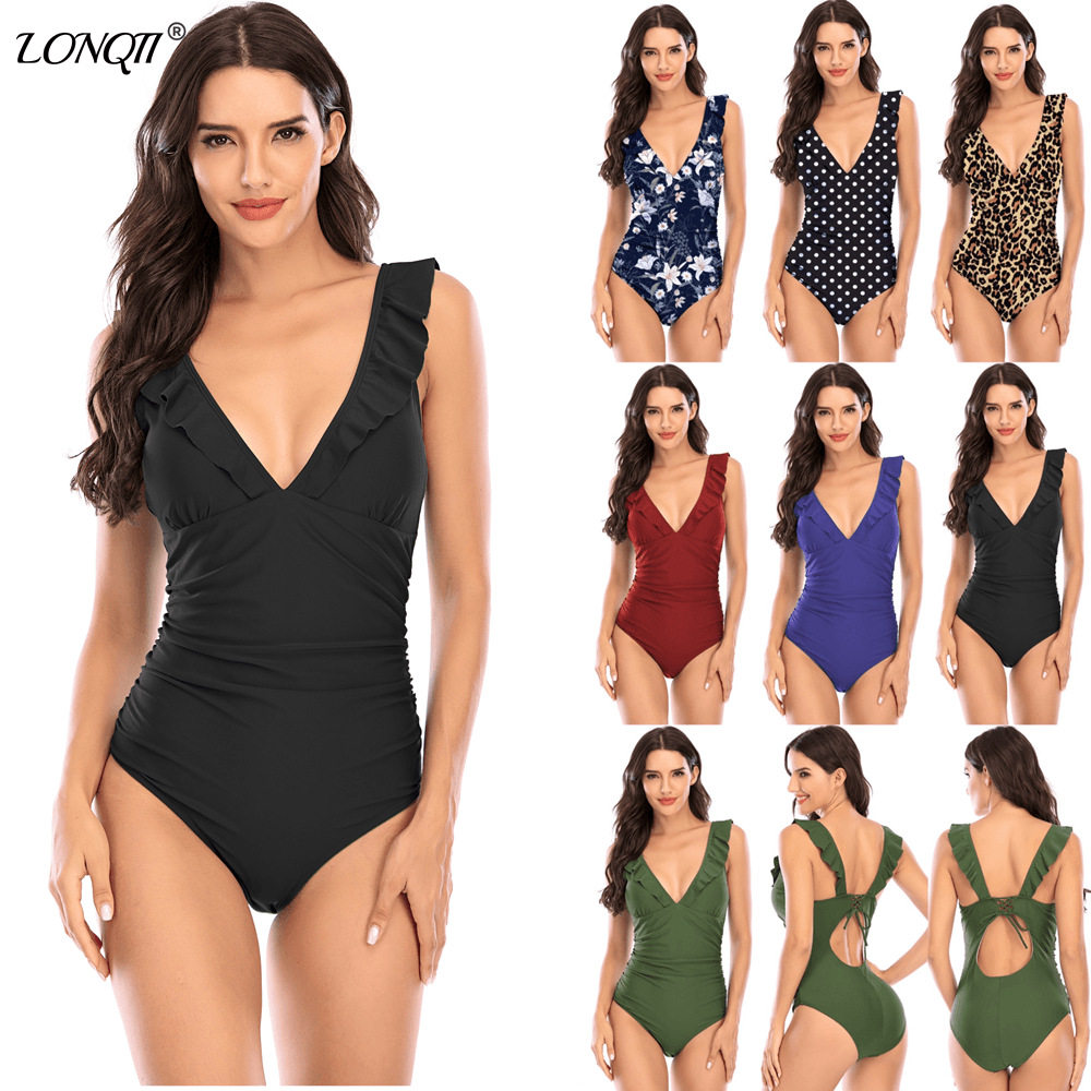 新款跨境外贸比基尼亚马逊纯色飞边遮肚显瘦连体保守泳衣女bikini
