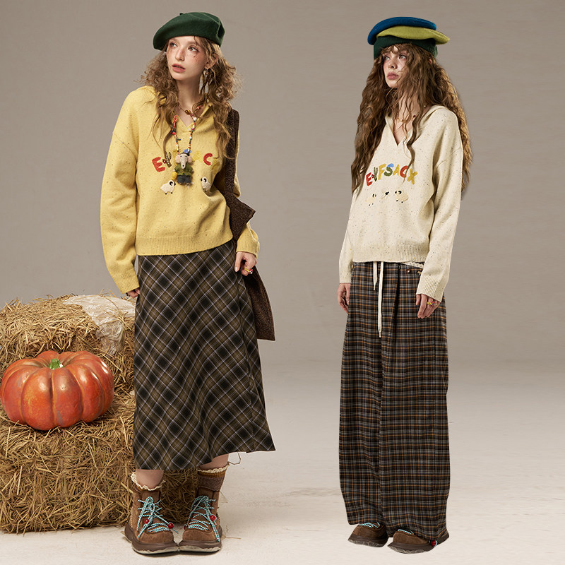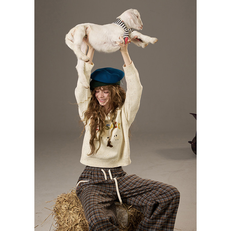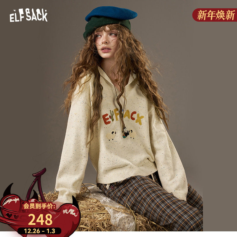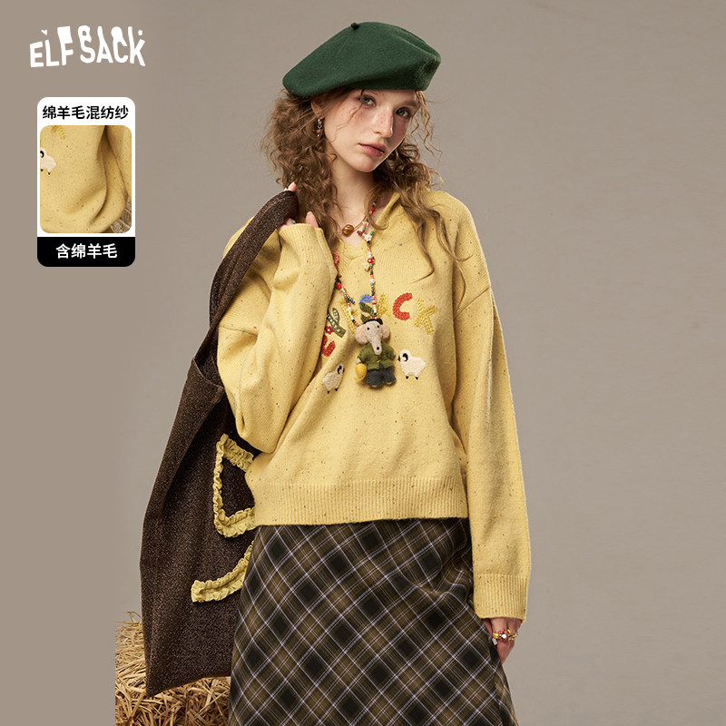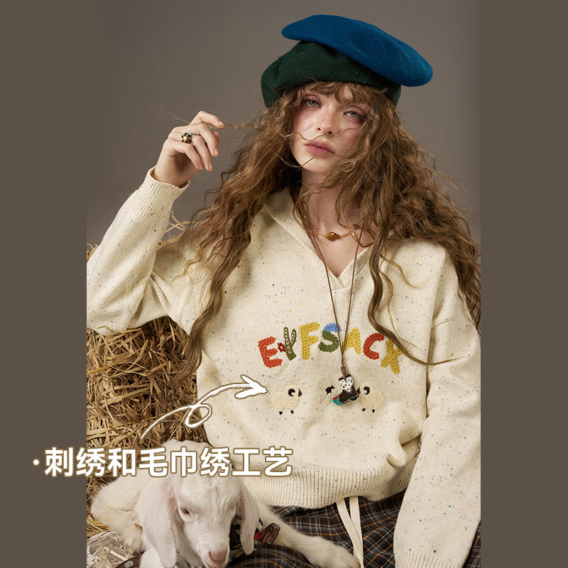 妖精的口袋字母刺绣v领毛衣女2025秋冬新款毛巾绣绵羊毛新年穿搭