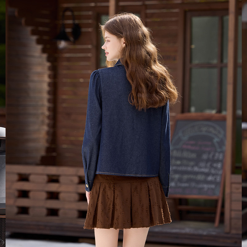 蝴蝶结装饰牛仔衬衫 木耳边拼接