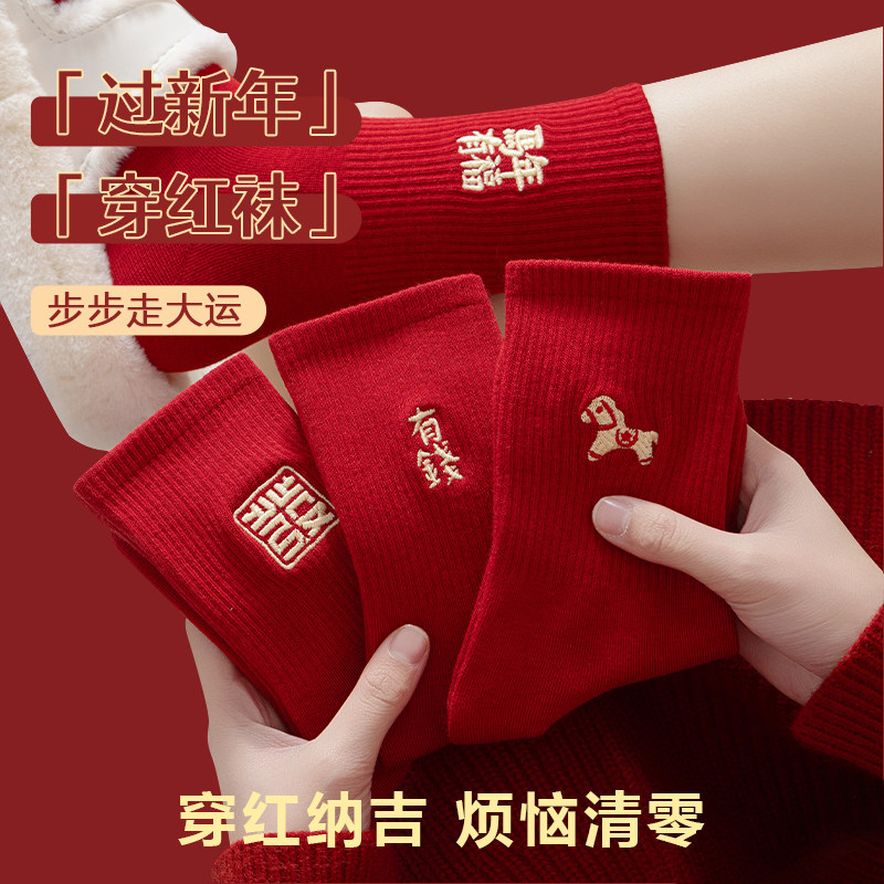 本命年红色袜子女款秋冬季防臭中筒袜2026马年新年袜情侣结婚长袜