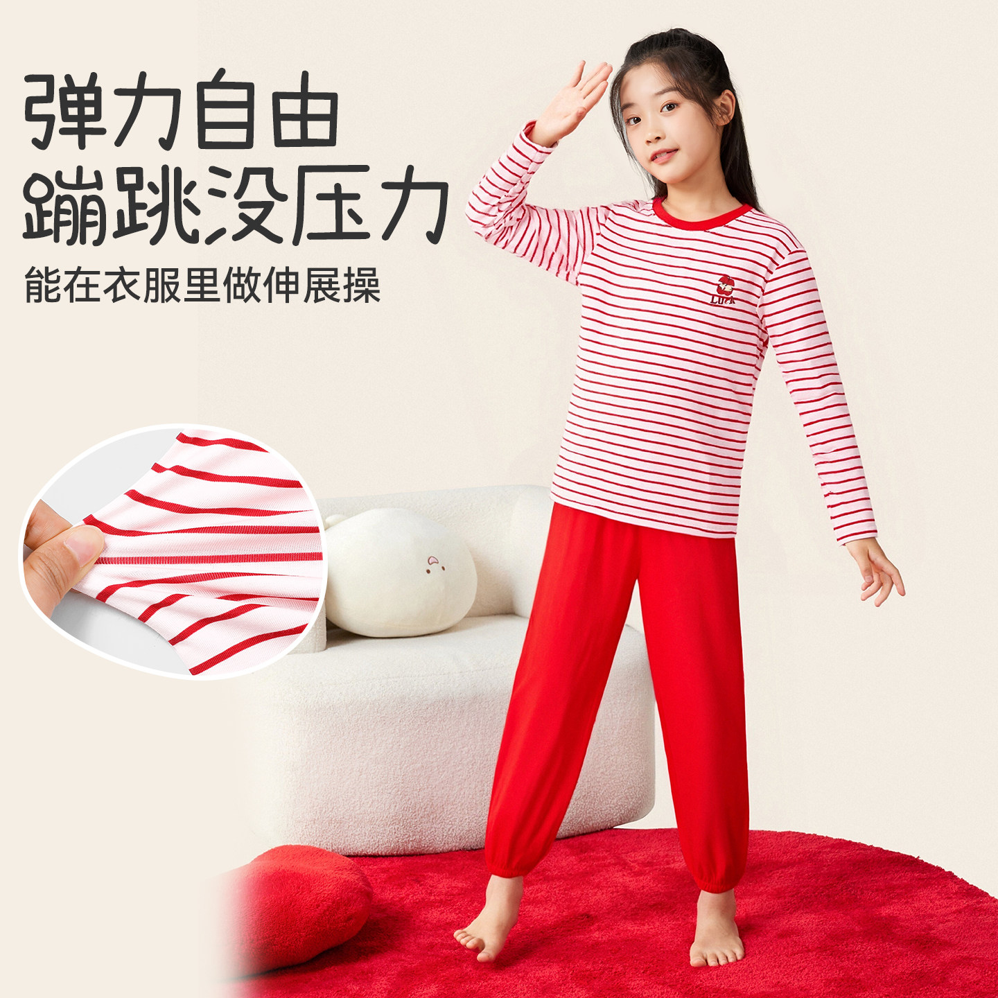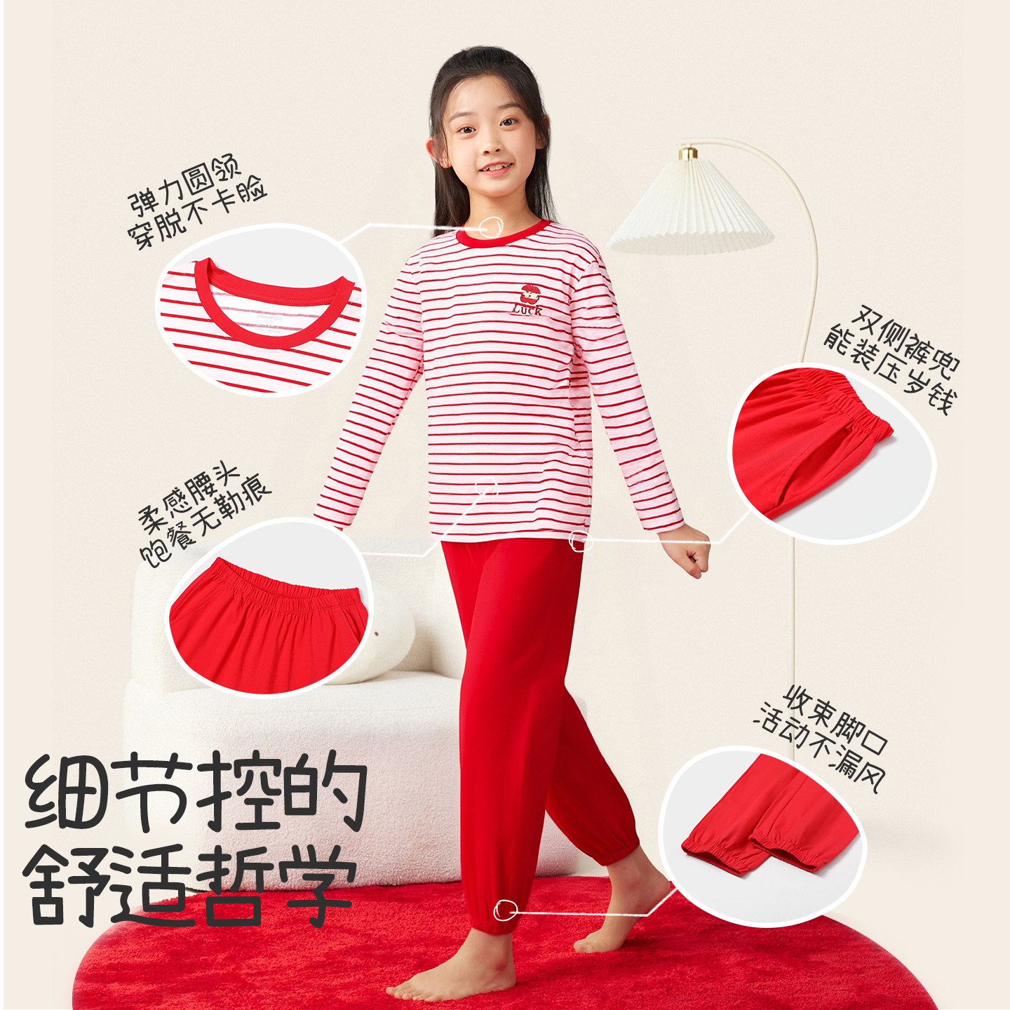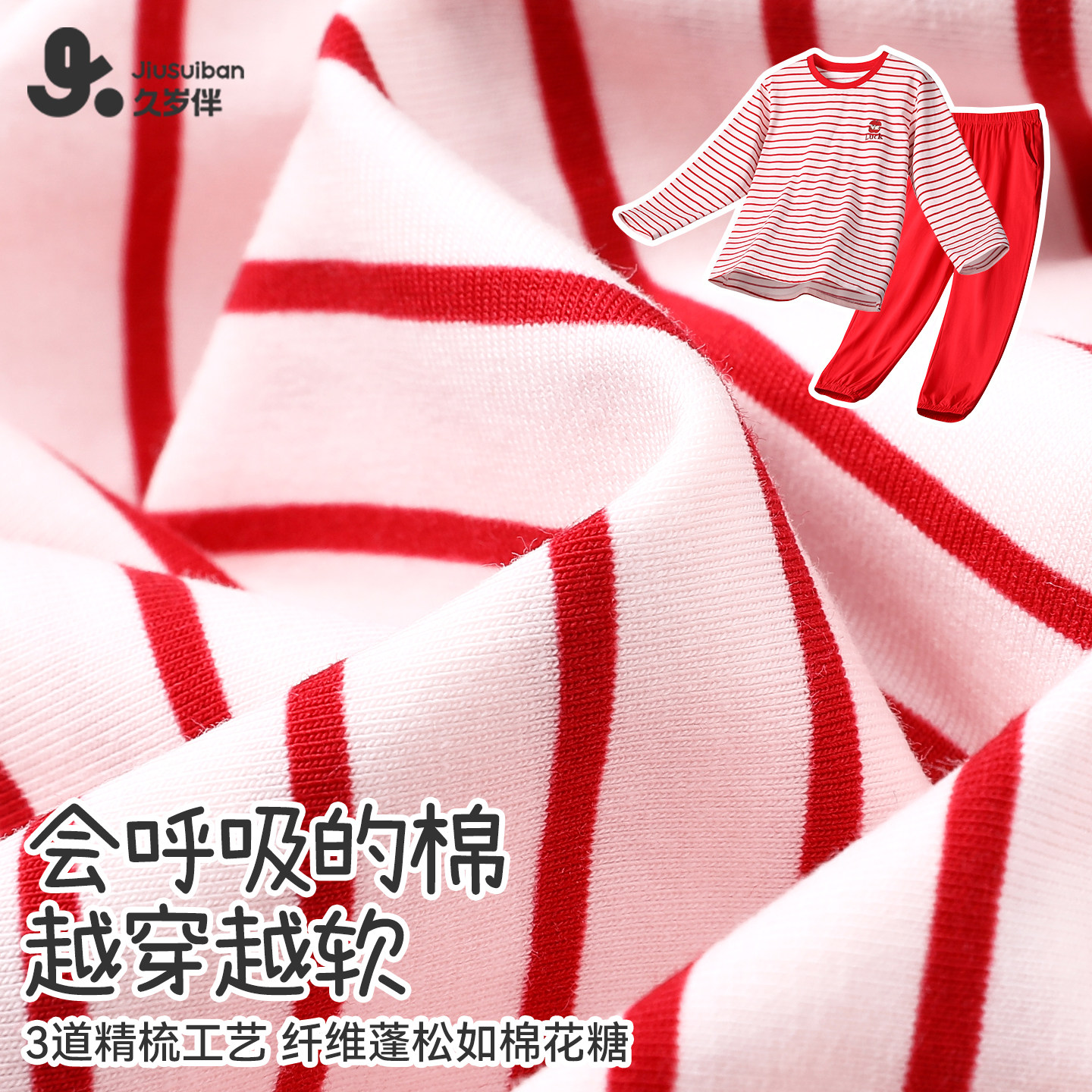 久岁伴儿童睡衣女童2025秋冬新品本命年红色条纹纯棉家居服套装