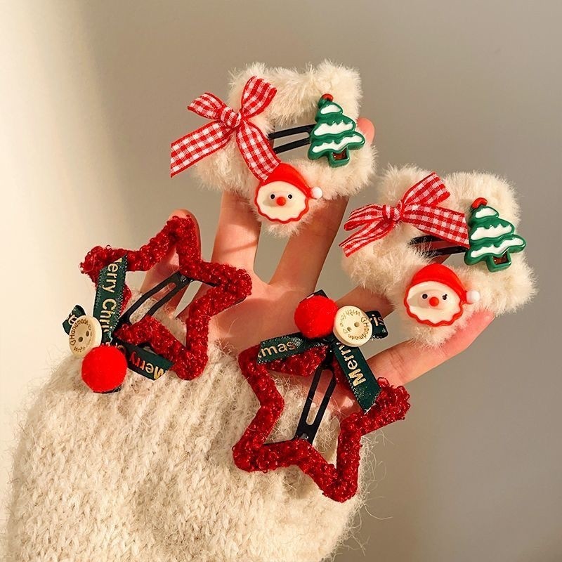 圣诞毛绒星星发夹女新年毛茸茸可爱蝴蝶结bb夹侧边刘海夹头饰发卡