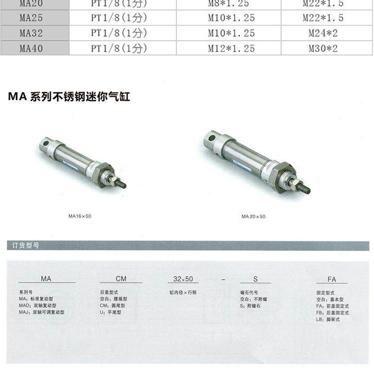 气动元件 不锈钢迷你气缸MA40*25/50/75/100/125/150/175/200/-S
