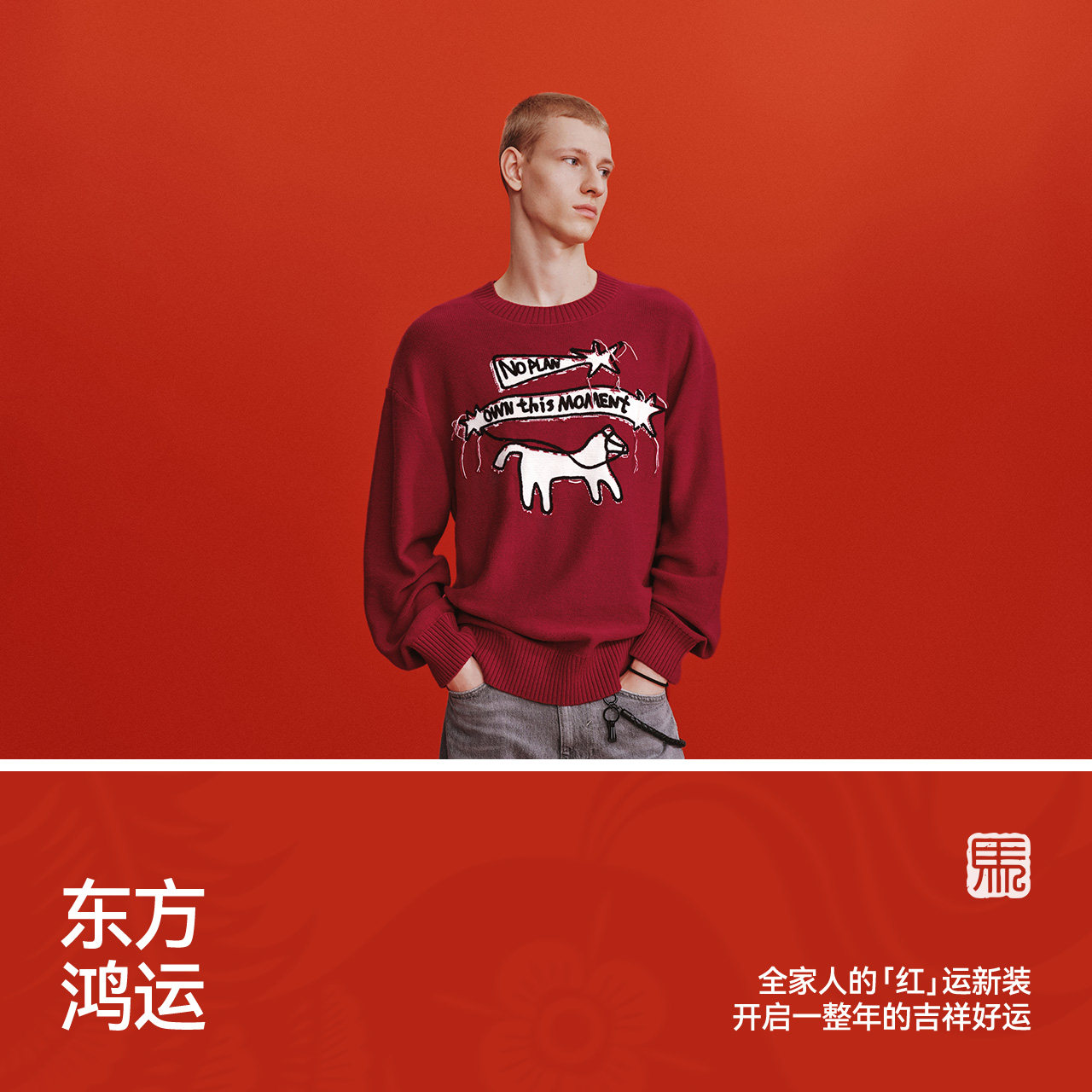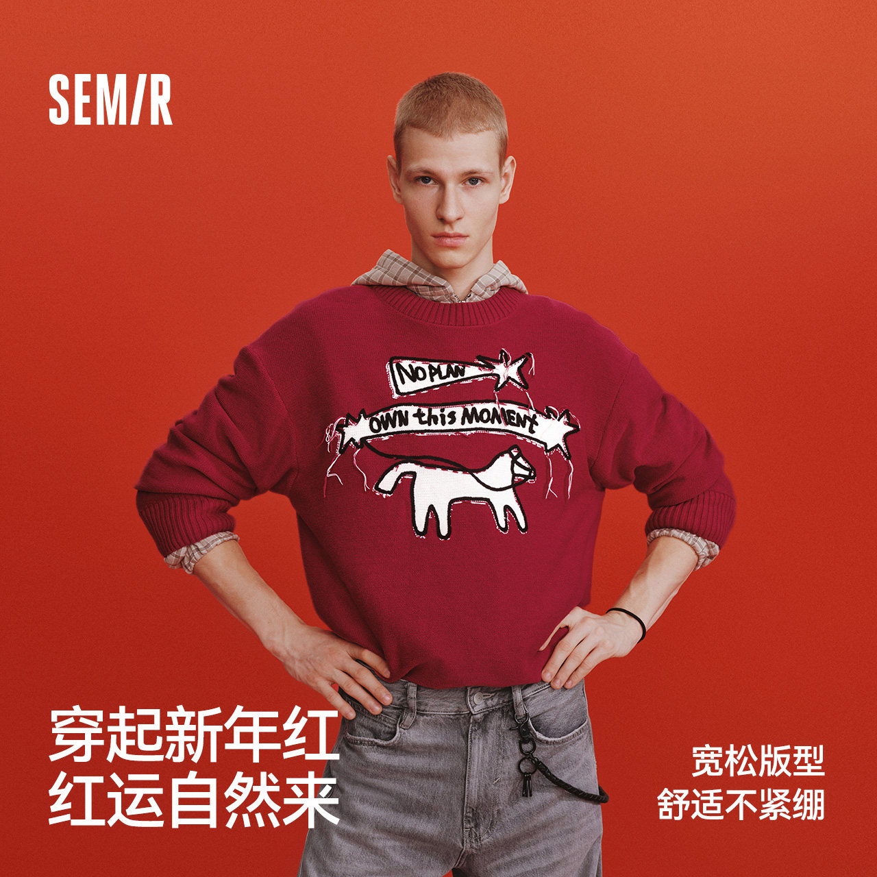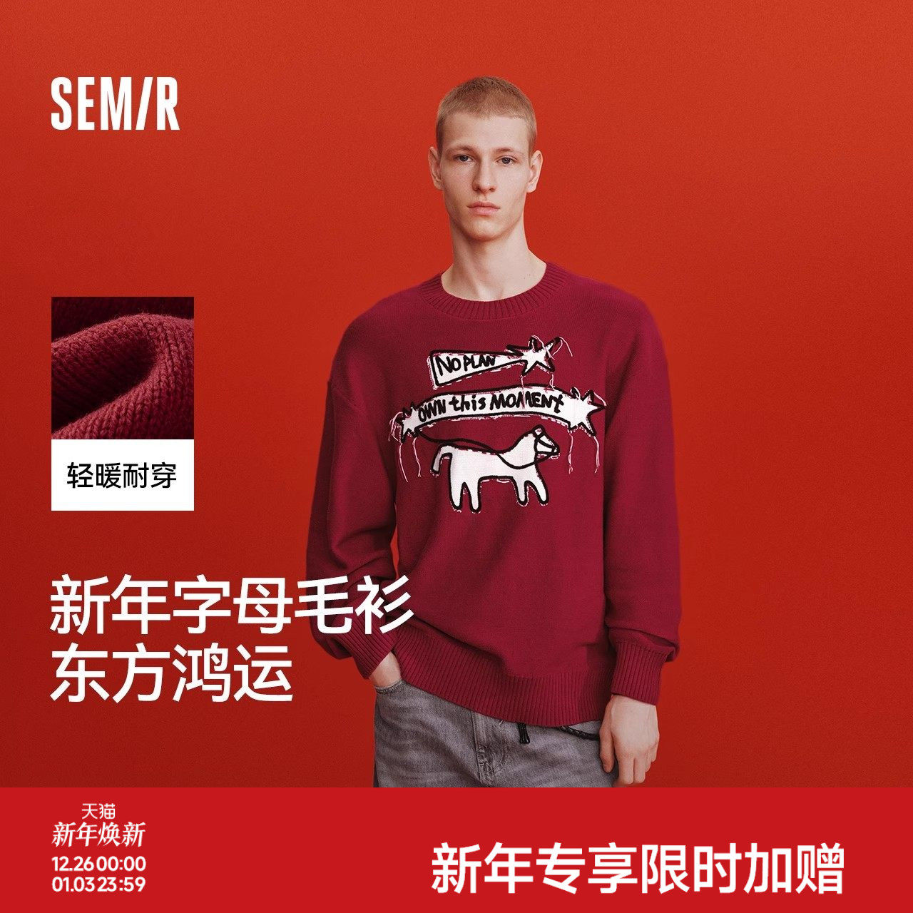 新年红 森马毛衫男春季宽松圆领字母提花针织衫2026新款流苏上衣