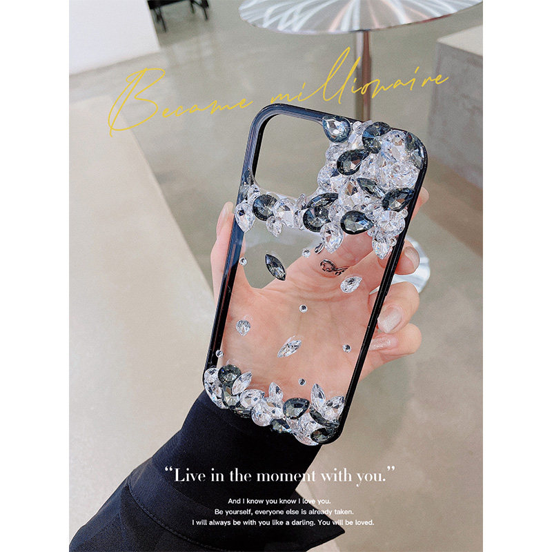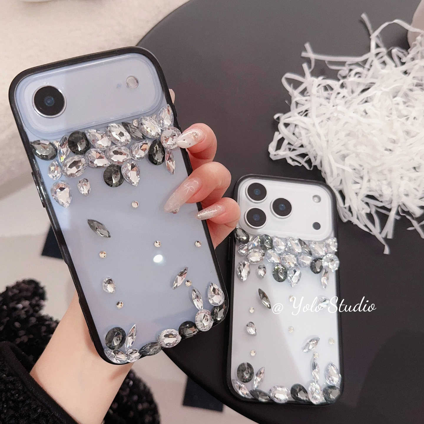 YOLO原创简约高级冷淡黑白适用iPhone16Promax水钻手机壳苹果17Pro透明爆闪14手机壳15Pro个性定制带钻保护套