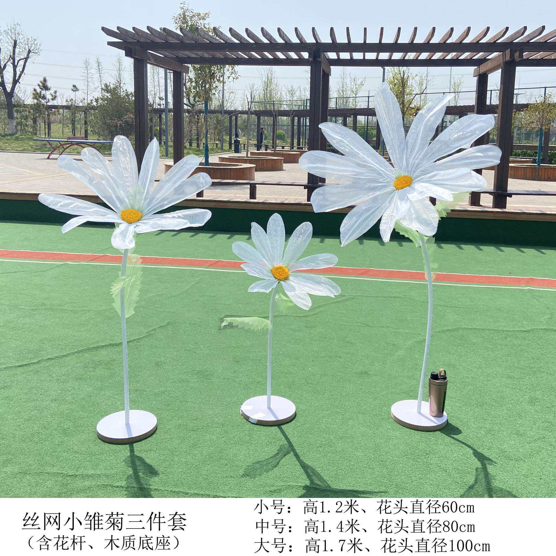 新款双层薄纱丝网花小雏菊花杆底座套装婚礼活动背景装饰拍摄道具