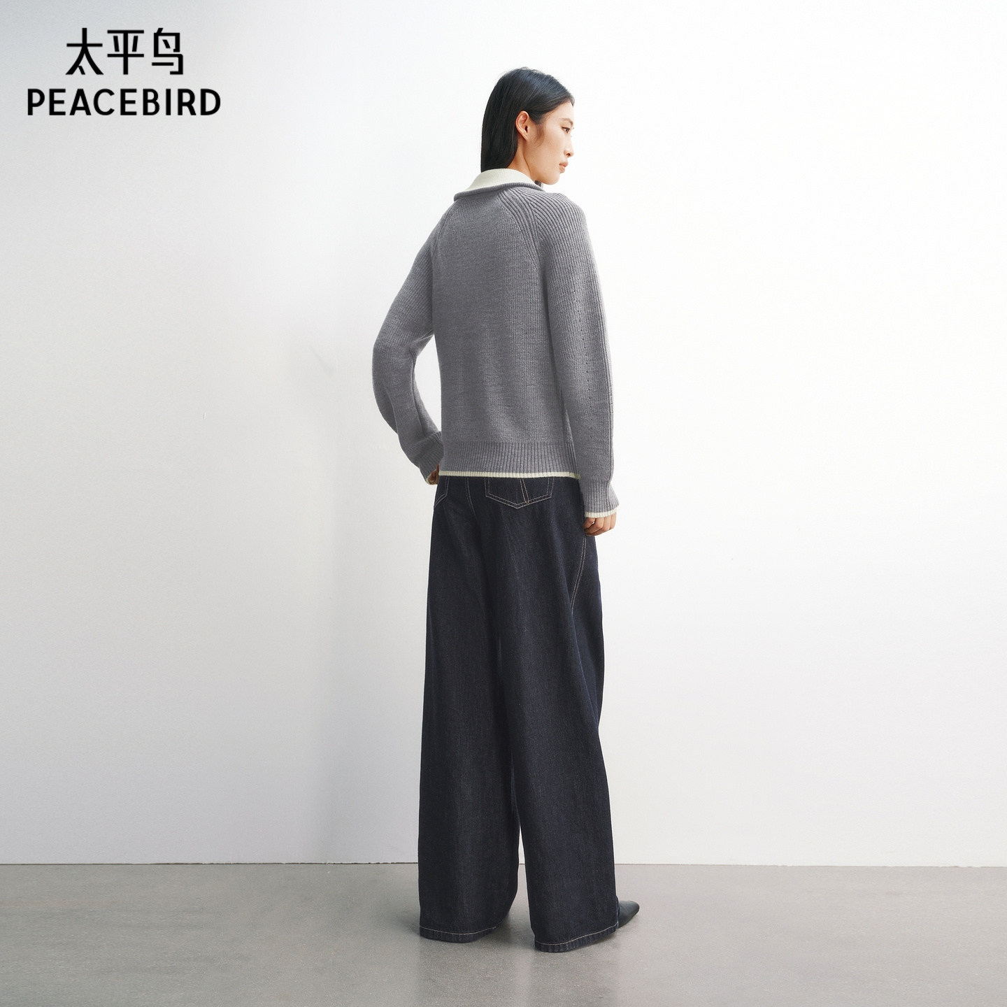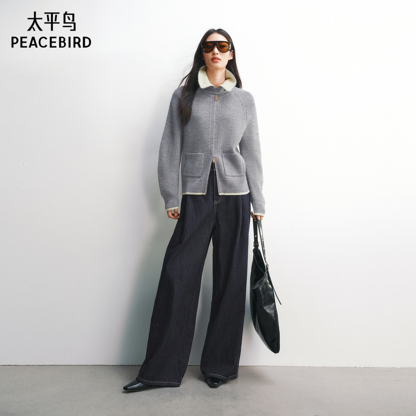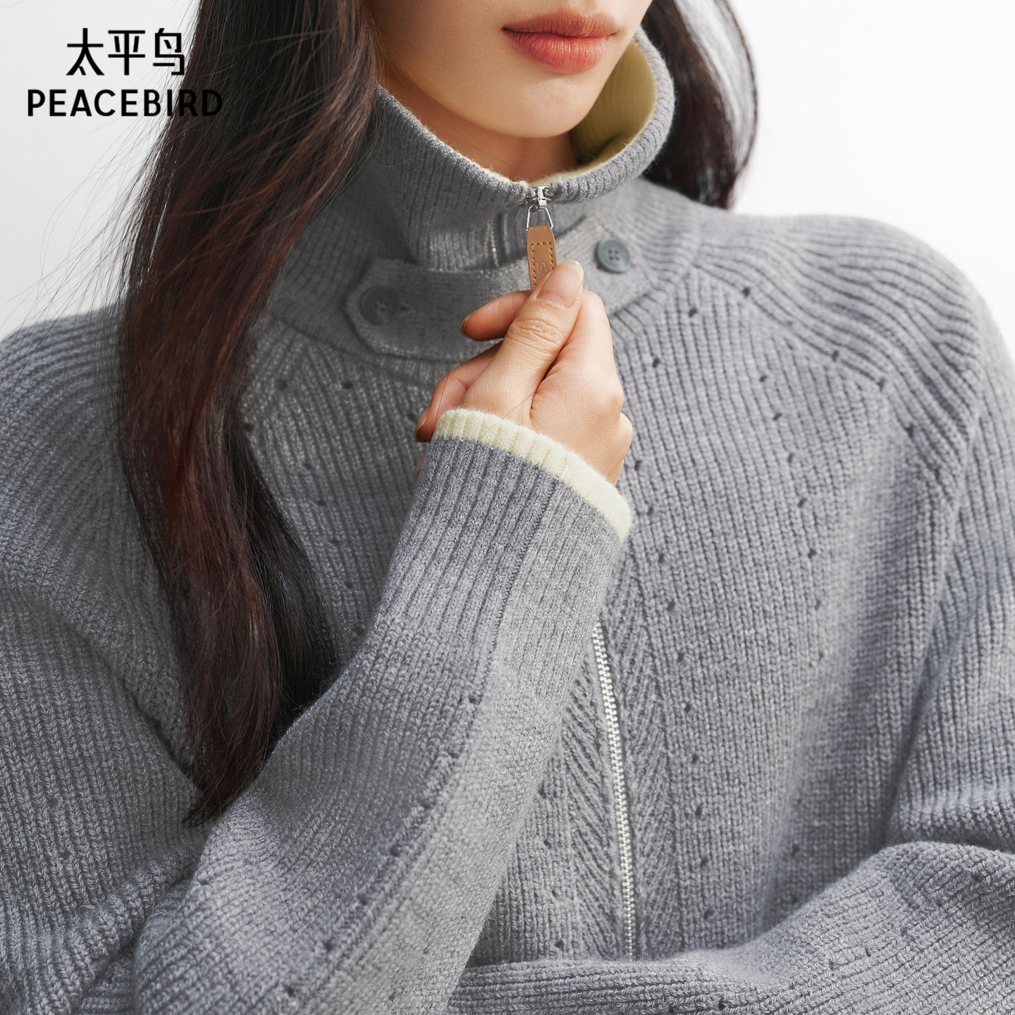 太平鸟 羊毛混纺双拉链针织开衫26春季新款撞色翻领休闲毛衫上衣