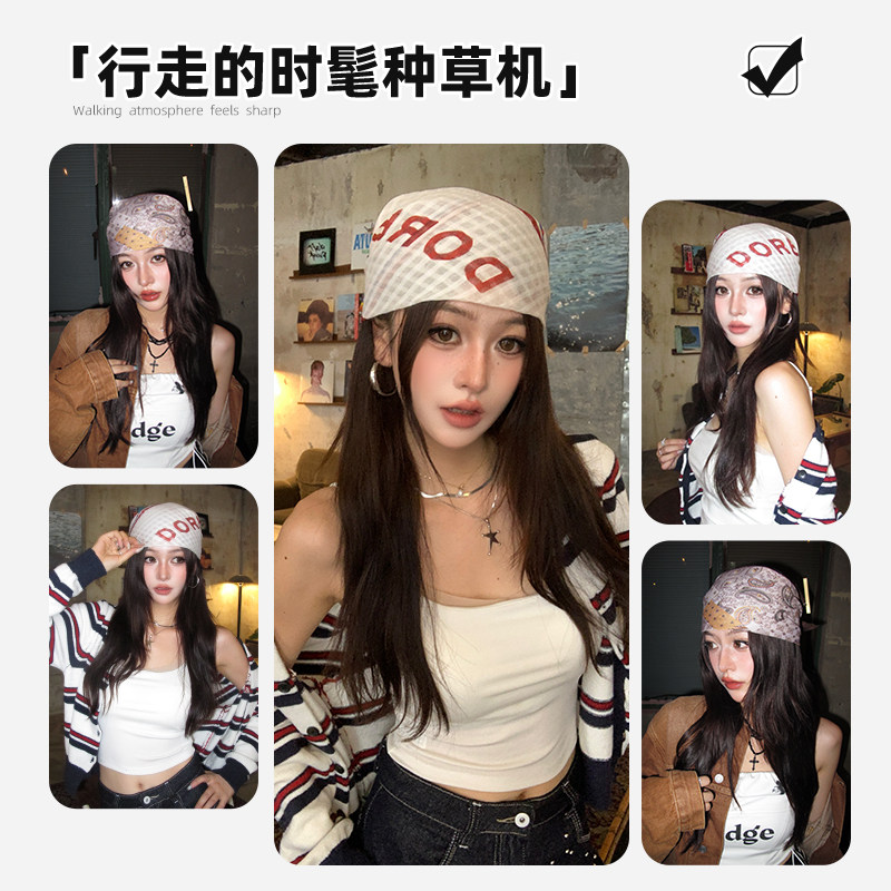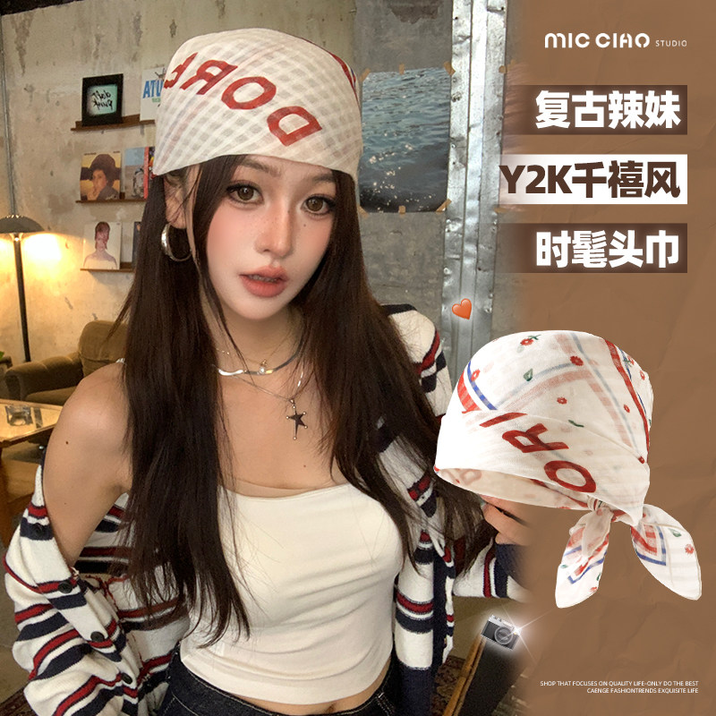 hiphop美式复古头巾包头巾Y2K千禧辣妹丝巾方巾街舞穿搭领巾蓝白