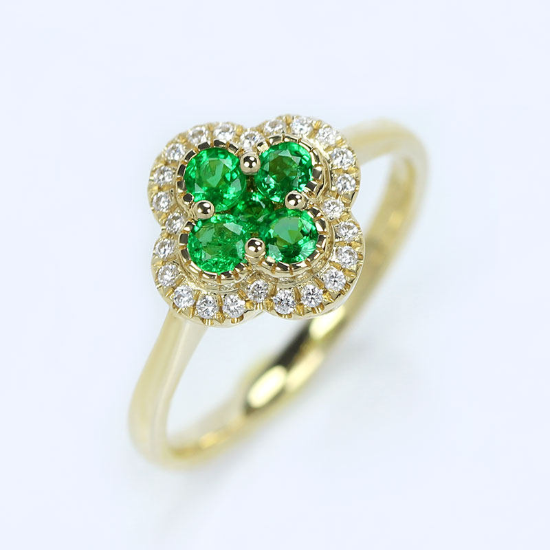 18K黄金天然祖母绿幸运四叶草戒指 翠亮绿宝石镶钻石指环女款定制