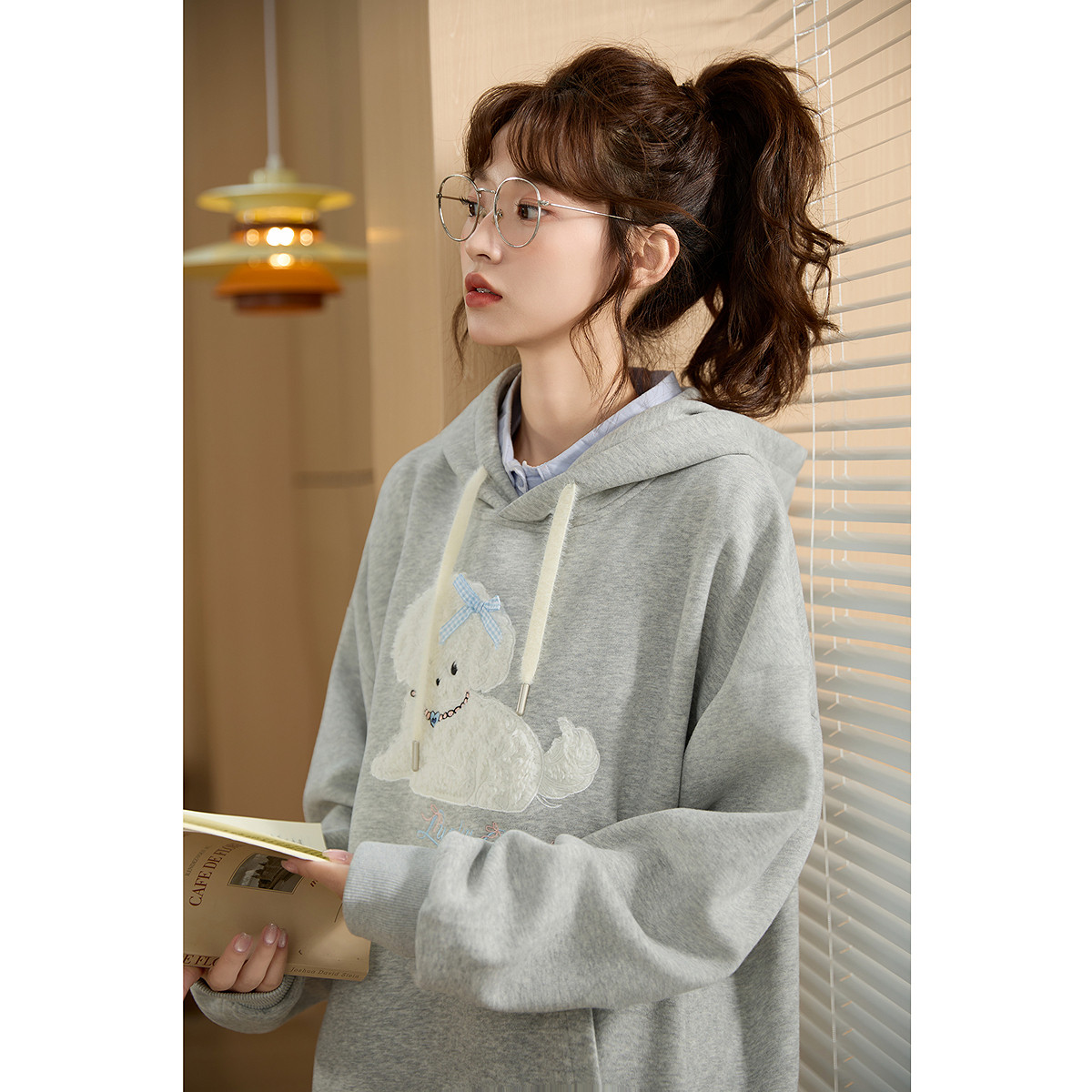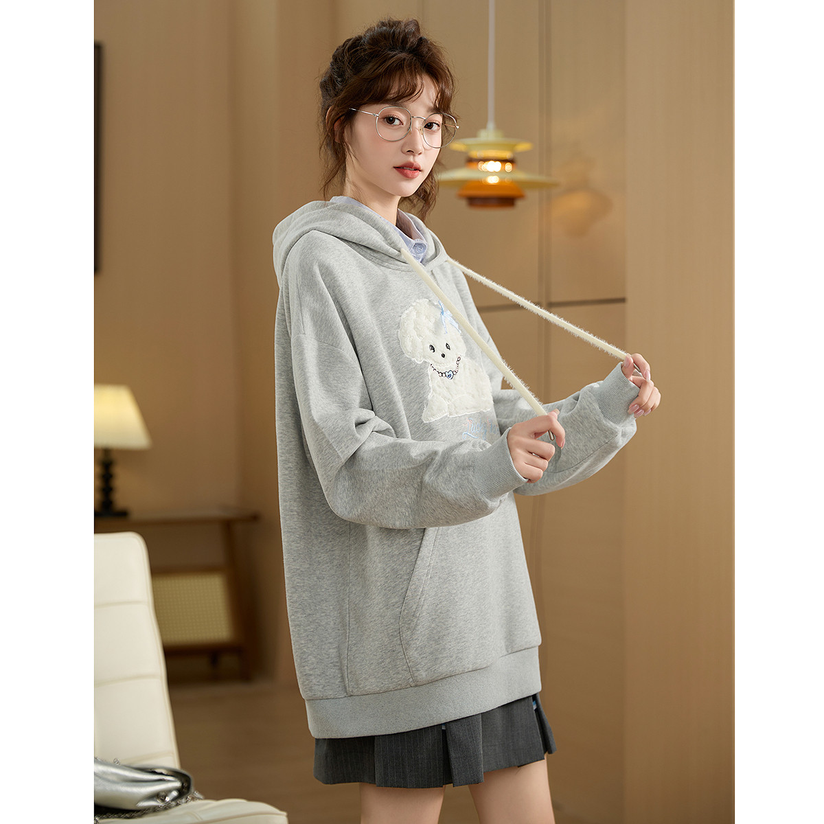 唐狮秋季新款灰色卫衣女韩版立体卷毛狗狗宽松连帽显瘦上衣TM