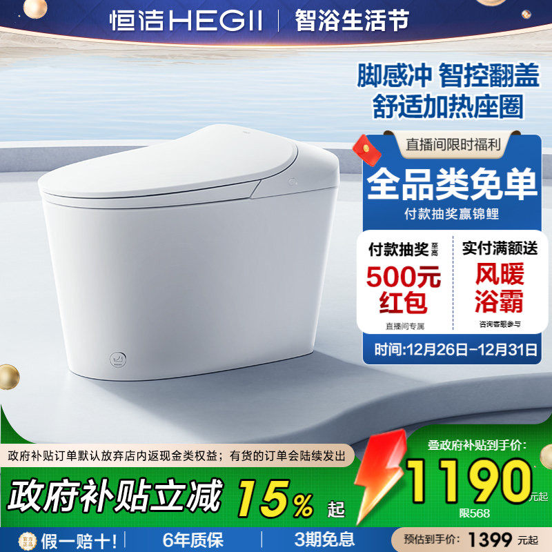 【抢直播间补贴】恒洁轻智能马桶自动抗菌佛山感应冲坐便器568P