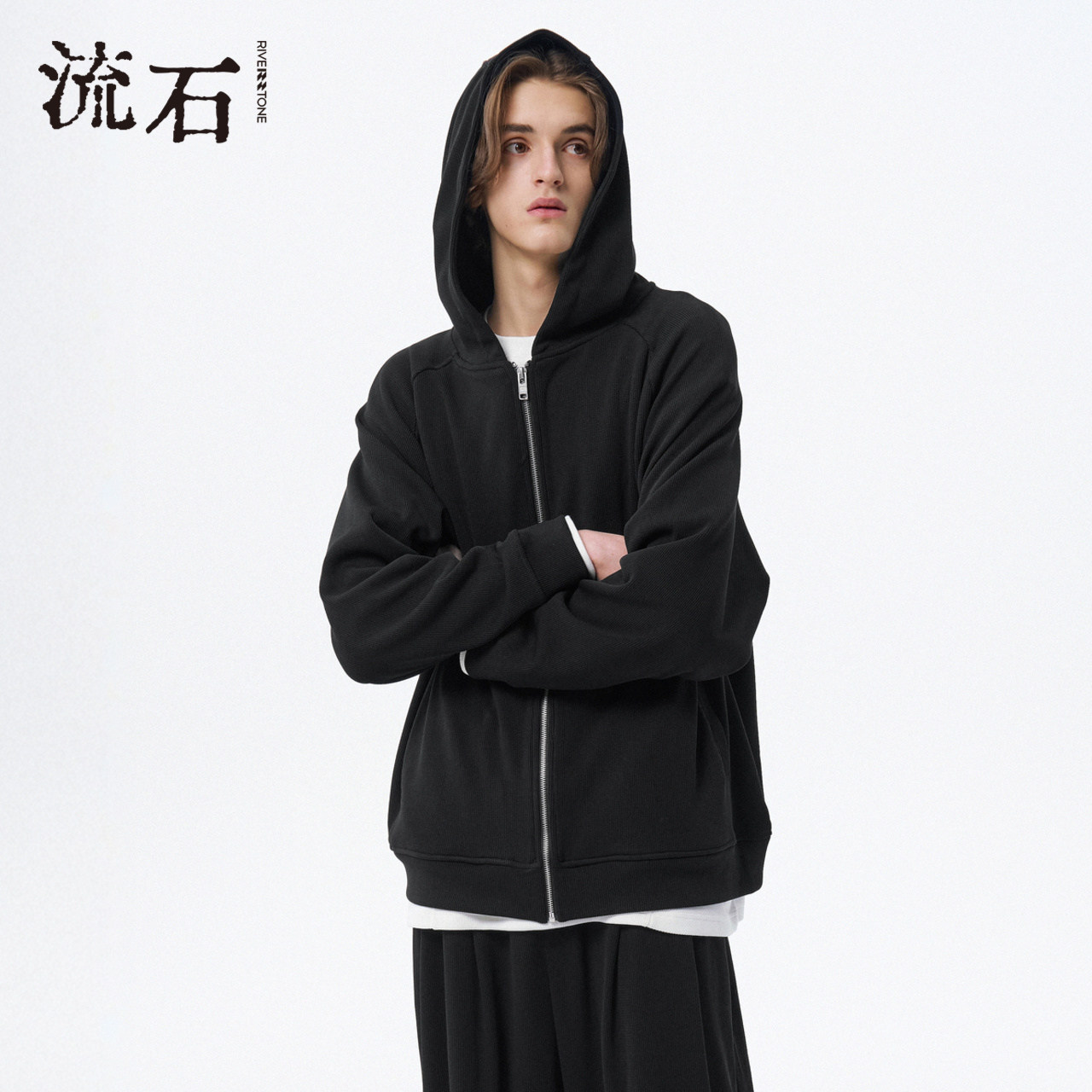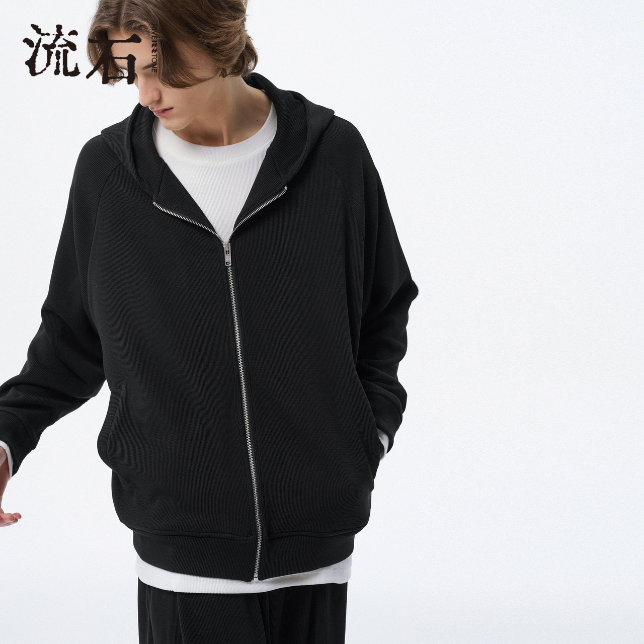 流石男装拉链长袖运动风卫衣外套2026年秋季新款男士黑色连帽开衫