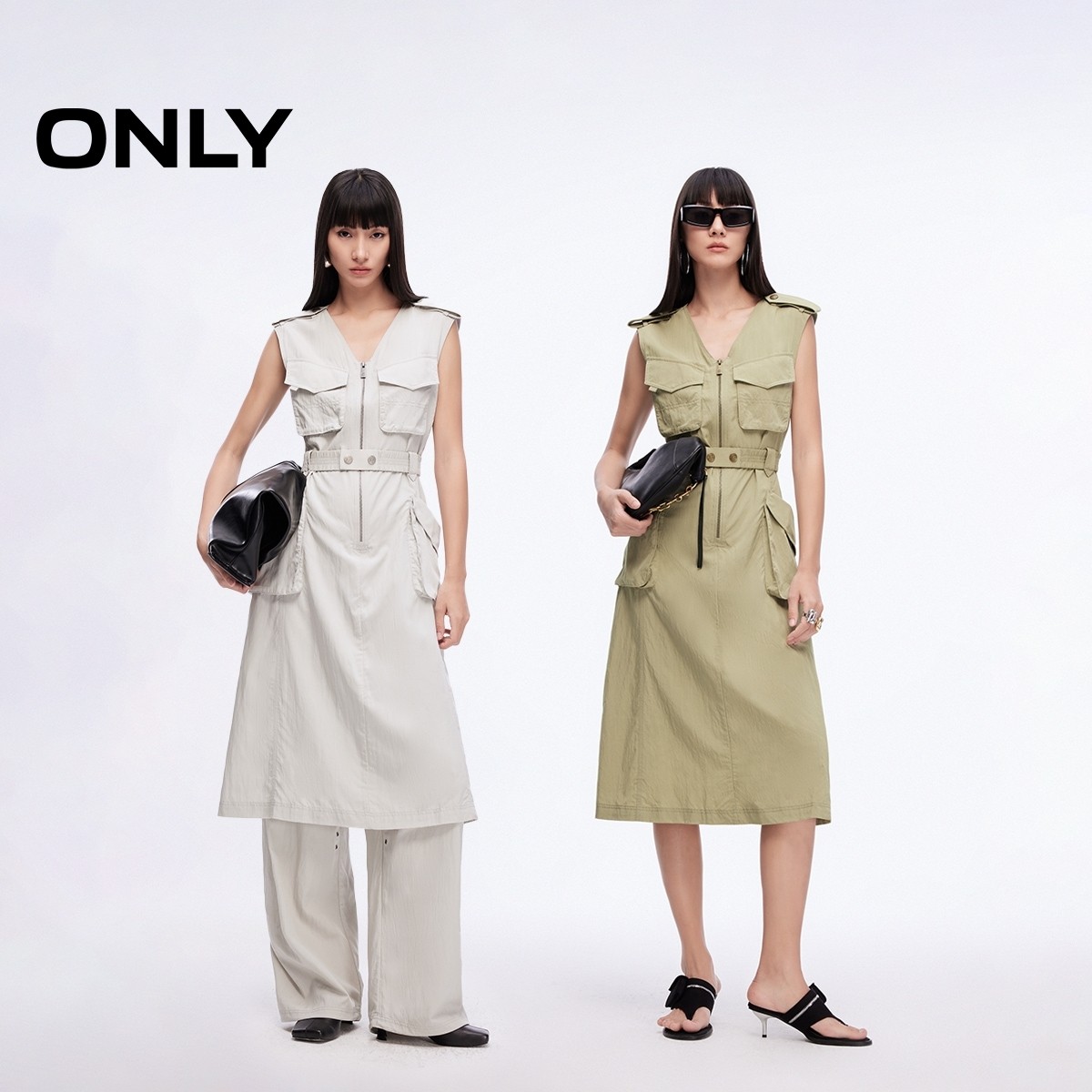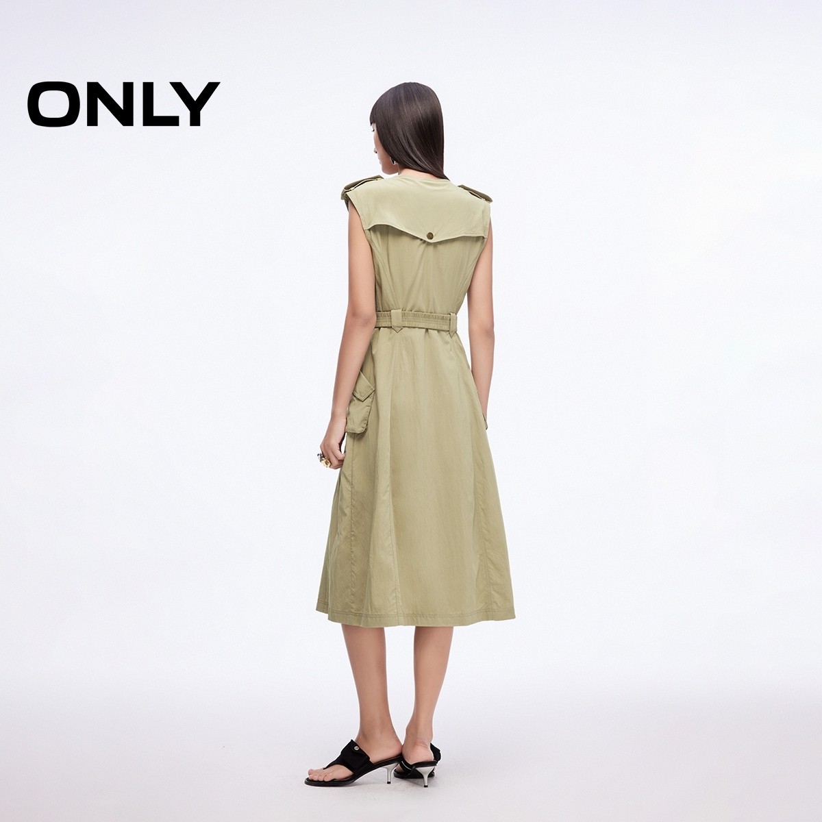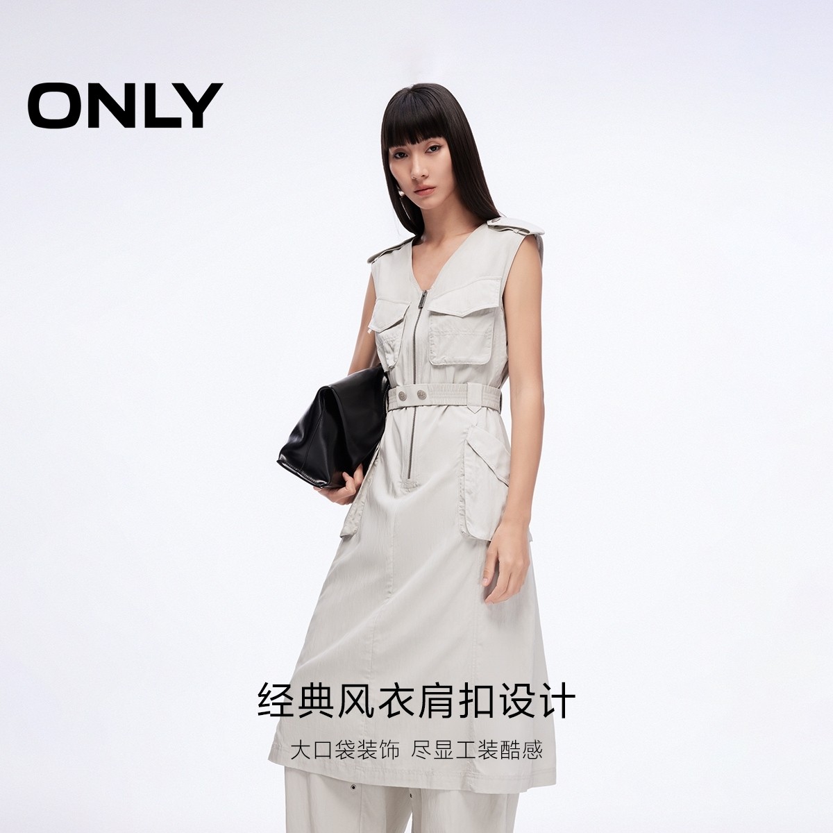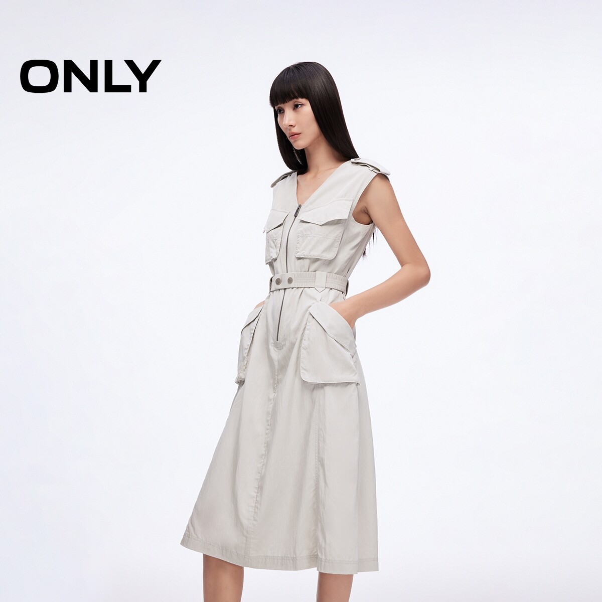 ONLY2025夏季新款工装风大口袋腰带纯色V领中长裙无袖连衣裙女
