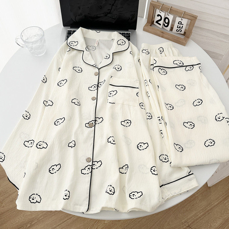 红豆春秋季云朵纯棉纱睡衣女款夏天长袖学生可爱开衫家棉花星星