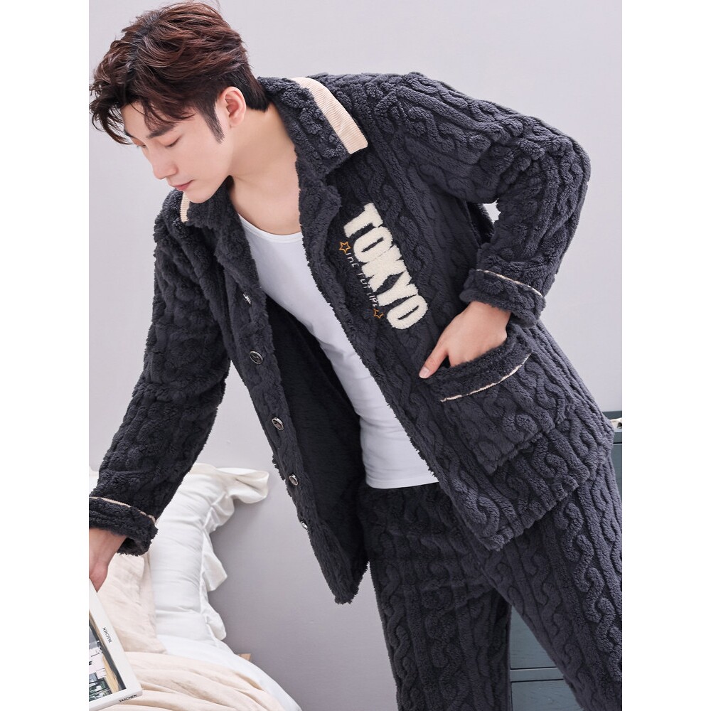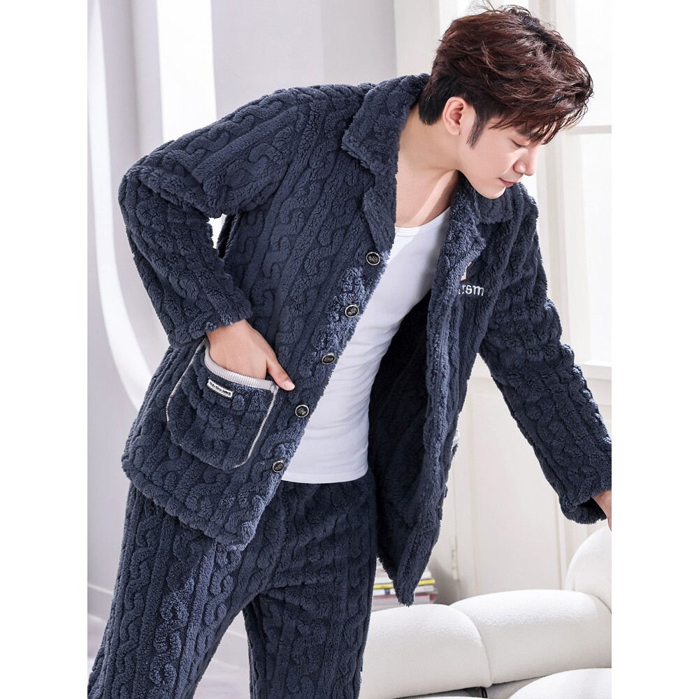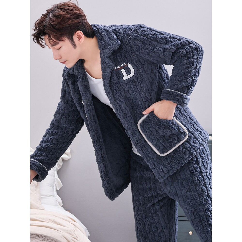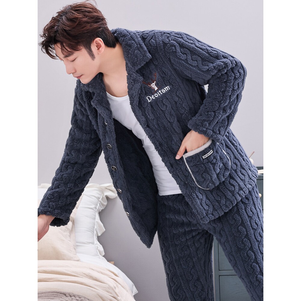 冬季珊瑚绒男士睡衣三层夹棉加厚加绒法兰绒秋冬款家居服保暖套装