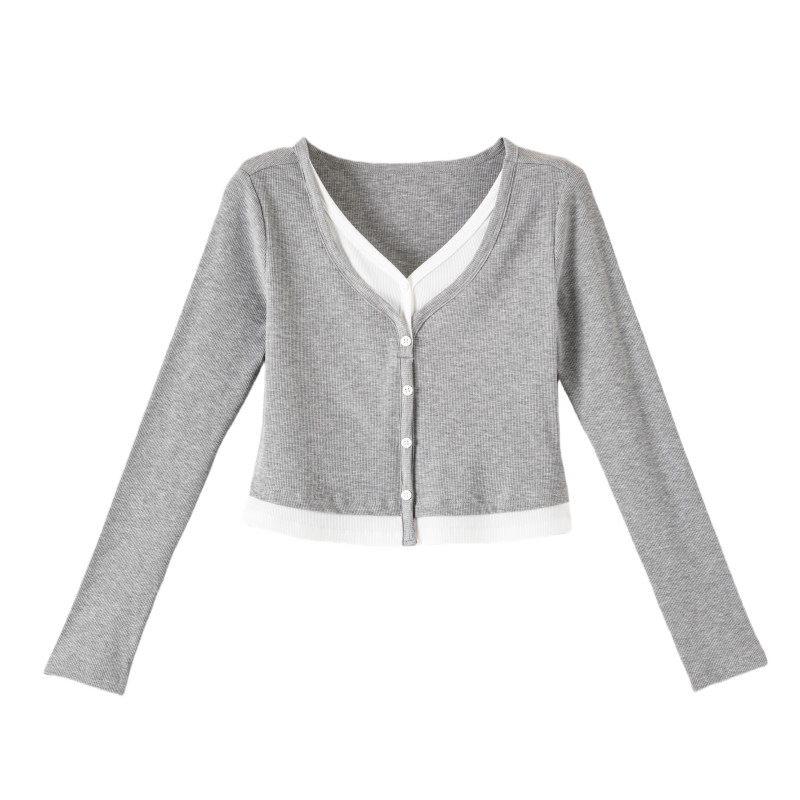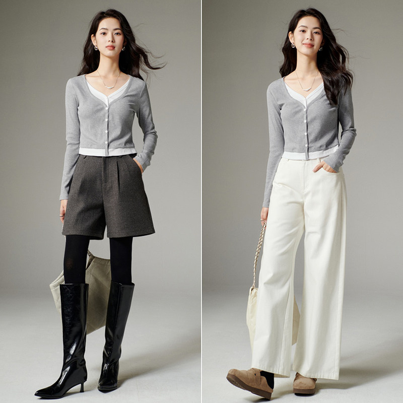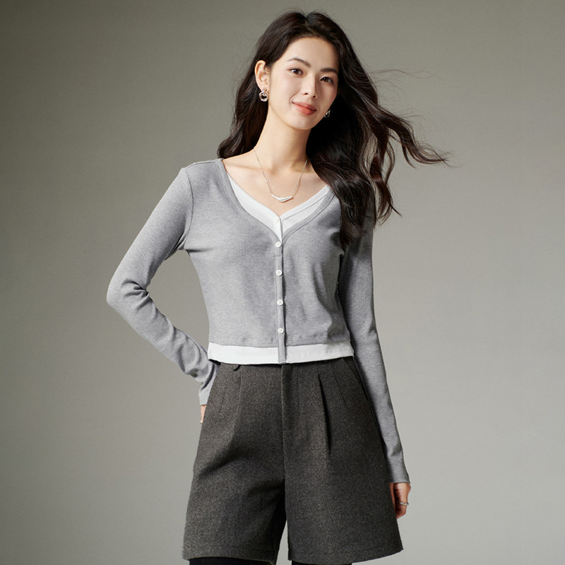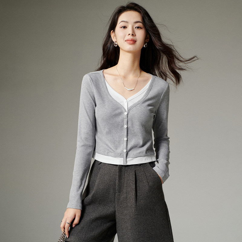 三福打底衫女2025新款秋季简约纯色收腰V领修身休闲长袖上衣女装
