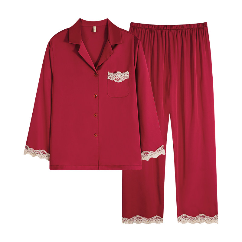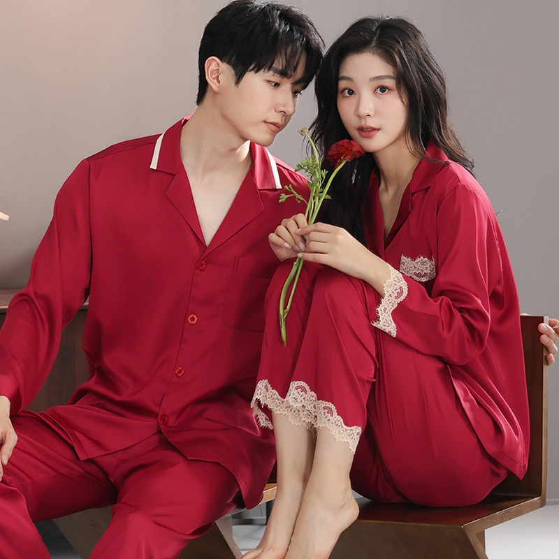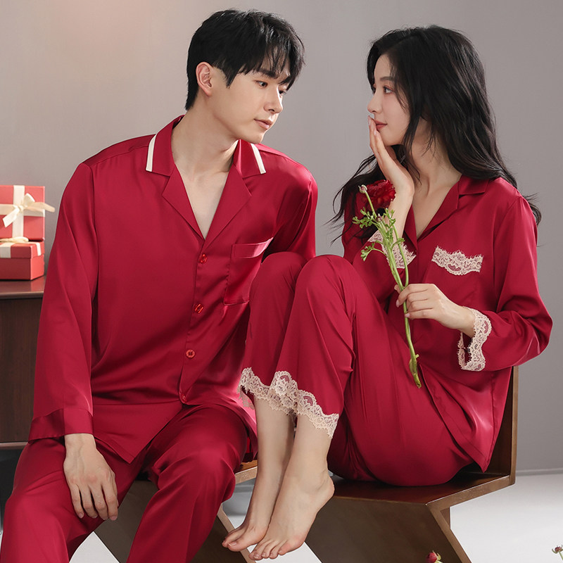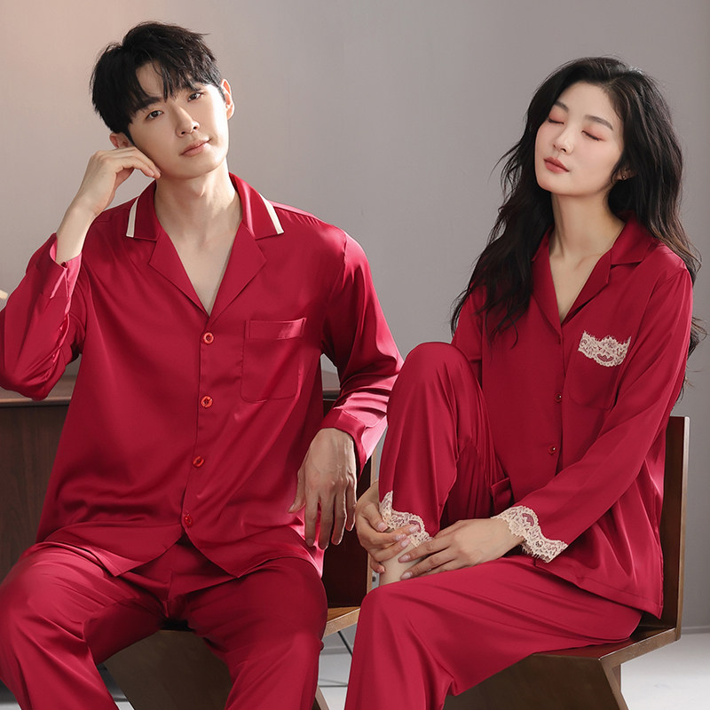 思馨坊红色睡衣结婚新婚情侣冰丝女春秋季薄款男士家居服长袖套装