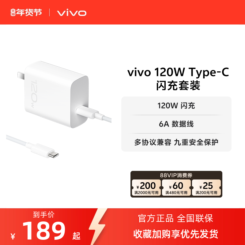 vivo 120W Type-C闪充充电器套装手机原装充电头含6A数据线typec充电线 6A/7.3A混发 均为vivo原装