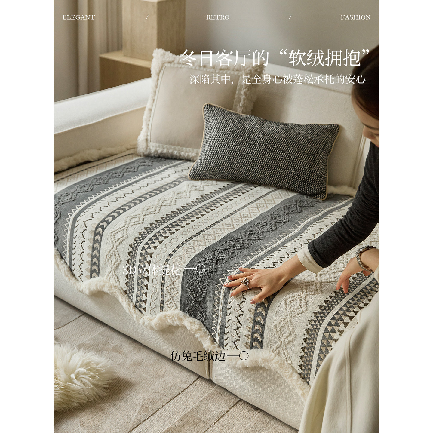 灰色冬毛绒现代轻奢加绒加厚防猫抓坐垫