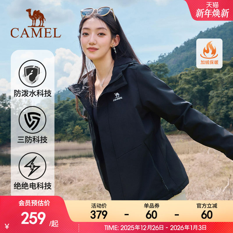 骆驼运动登山服外套女士秋冬加绒连帽夹克户外防风防水休闲茄克男