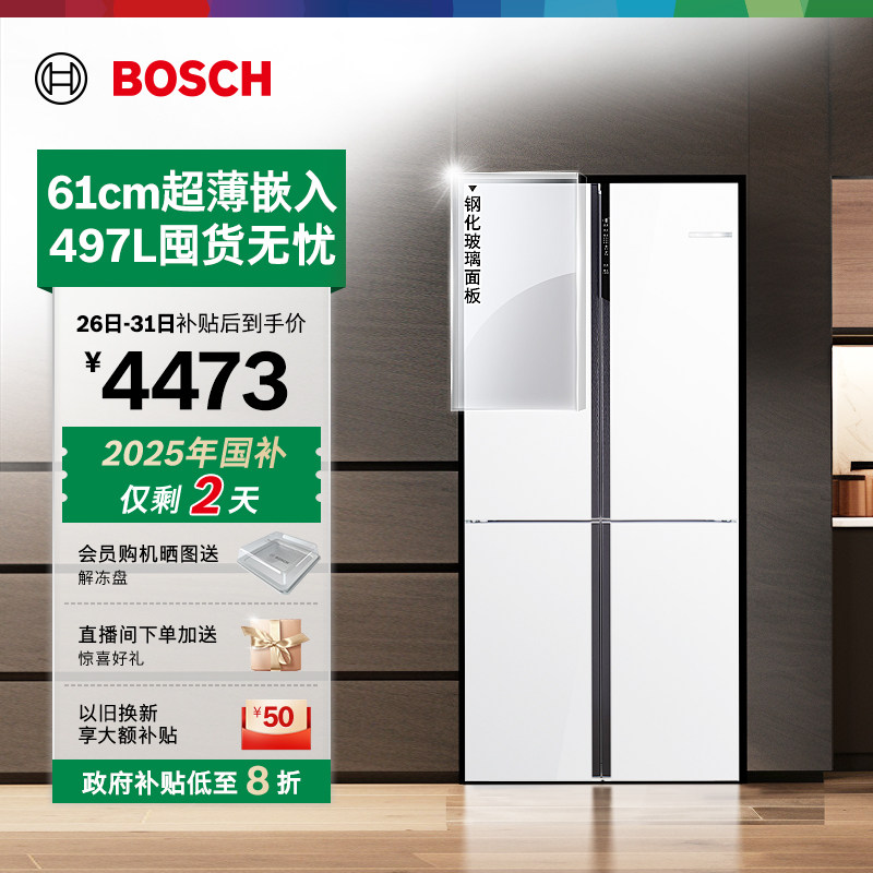 【以旧换新】博世小白鲸497L超薄嵌入冰箱家用一级玻璃十字四门