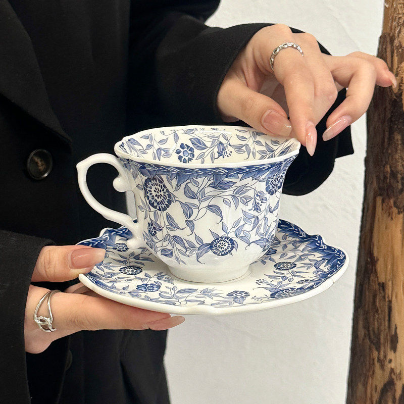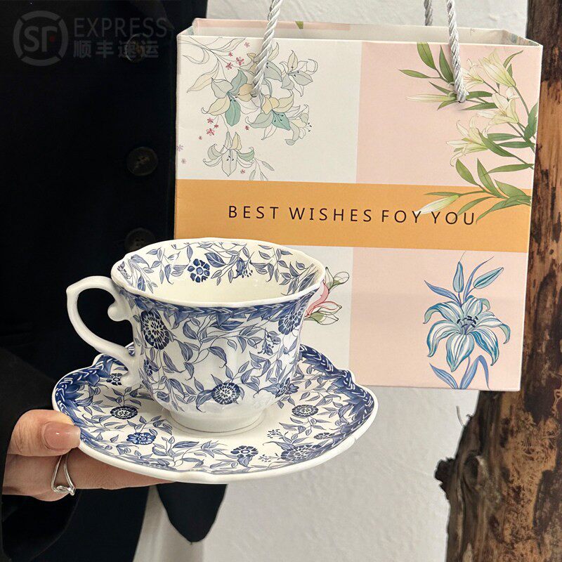 中古风青花陶瓷咖啡杯碟精致复古下午茶马克杯女生伴手礼生日礼物