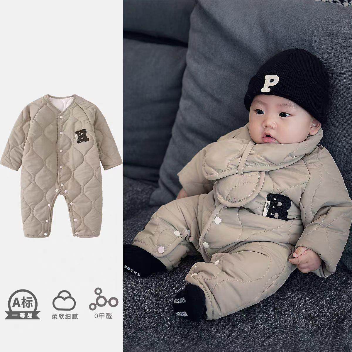 婴儿连体衣秋冬加厚保暖男宝宝外出棉服韩版冬装送围巾宝宝爬爬服