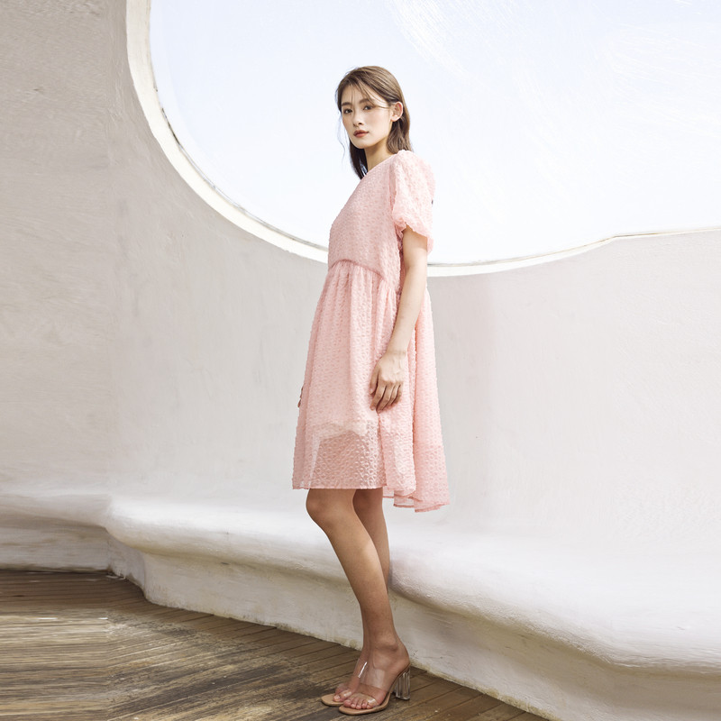 婉甸2025夏季新品嫩粉色泡泡皱短袖连衣裙1242N58RT4