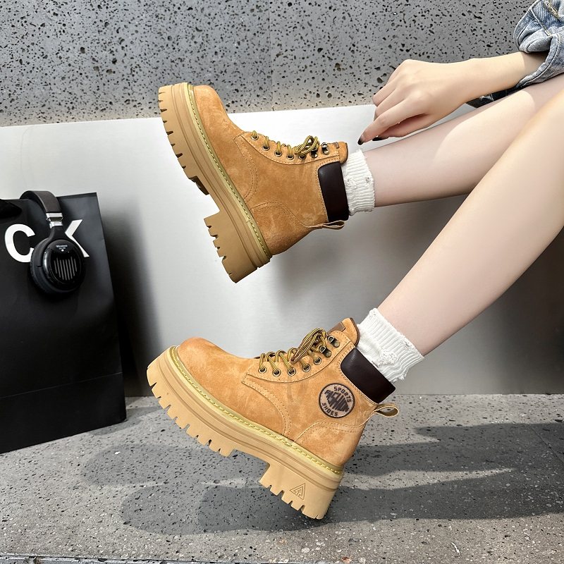天美意厚底增高加绒英伦马丁靴大黄靴女鞋子休闲短靴皮靴冬季新款